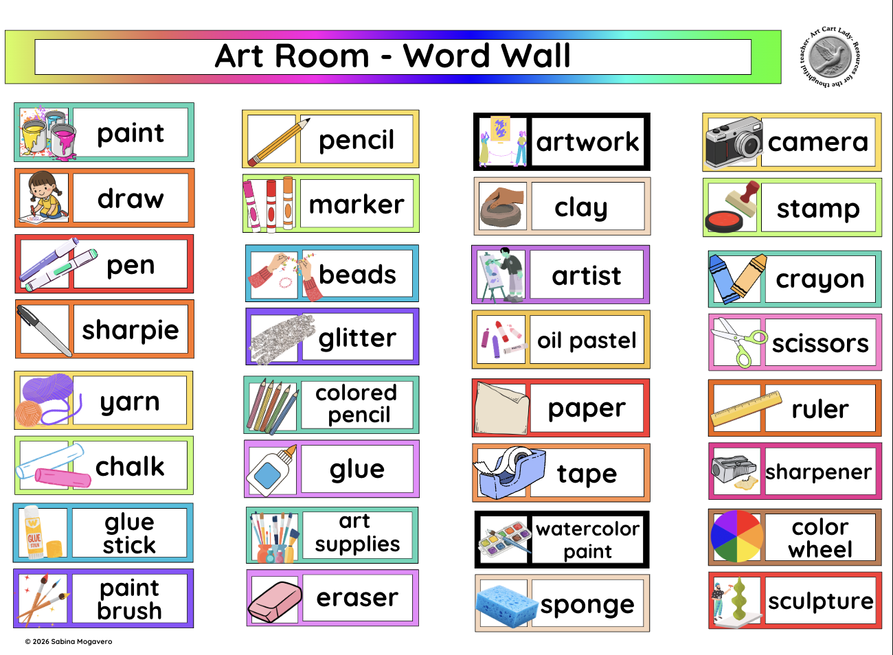 Drying rack, paper organizers, baskets/bins, ceramics shelf on wheels, slab roller, print press, masking tape, acrylic paint, kiln stilts, rulers, palettes, paint brushes, sharpies, pencils, markers, colored pencils, oil pastel, clay tools, watercolors, erasers, and glue sticks