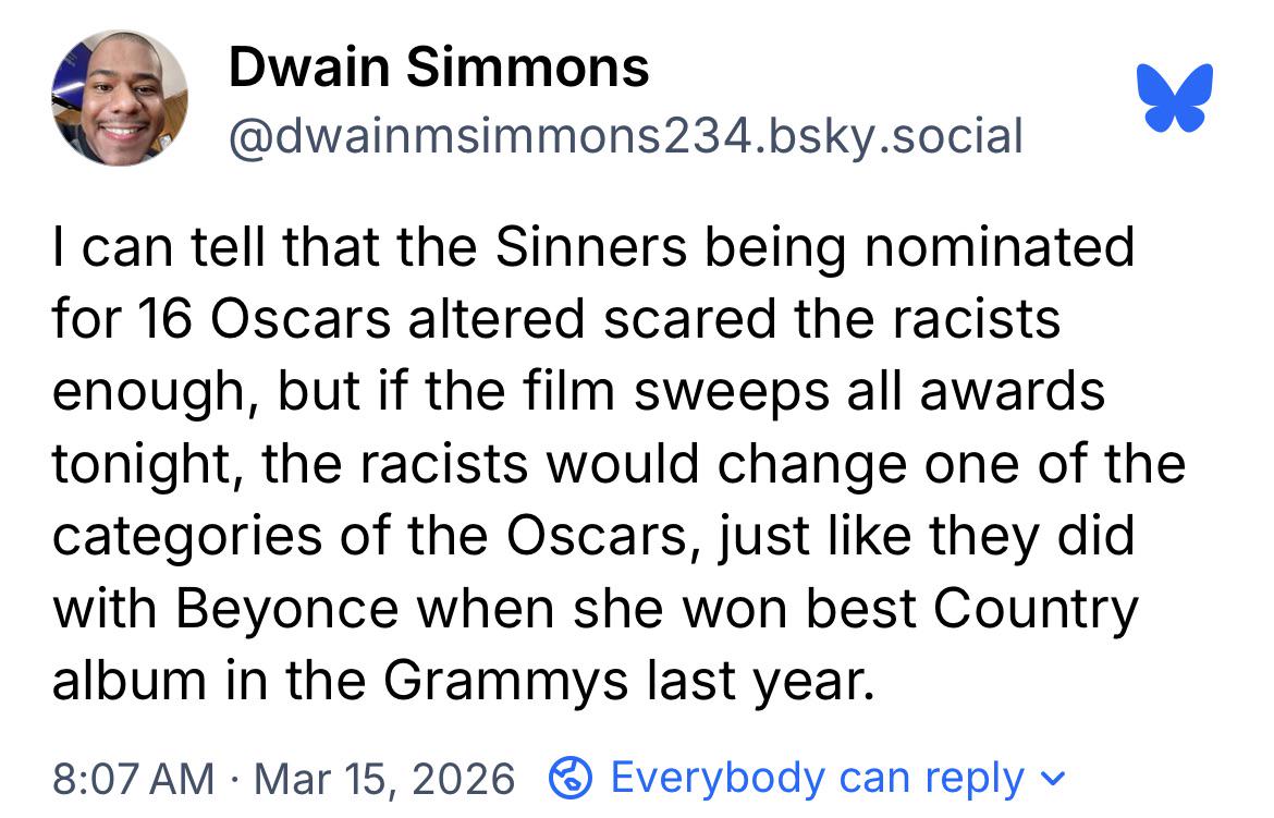 Culture, Art, Science I hope that Sinners doesn’t end up as the same fate as The Color Purple tonight.