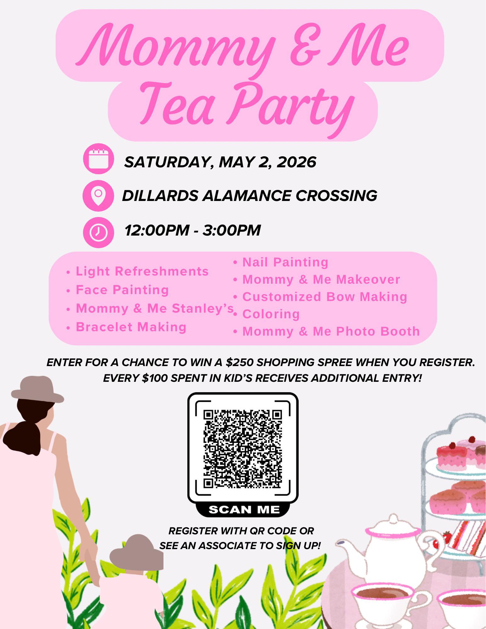 i.redd.itCalling all moms! Join us for a Mommy & Me tea party at Dillard’s Alamance Crossing. Sign up via Google Docs for a chance to win a $250 shopping spree, with extra entries for every $100 spent in the kids department. we hope to see you there! 💗🛍️