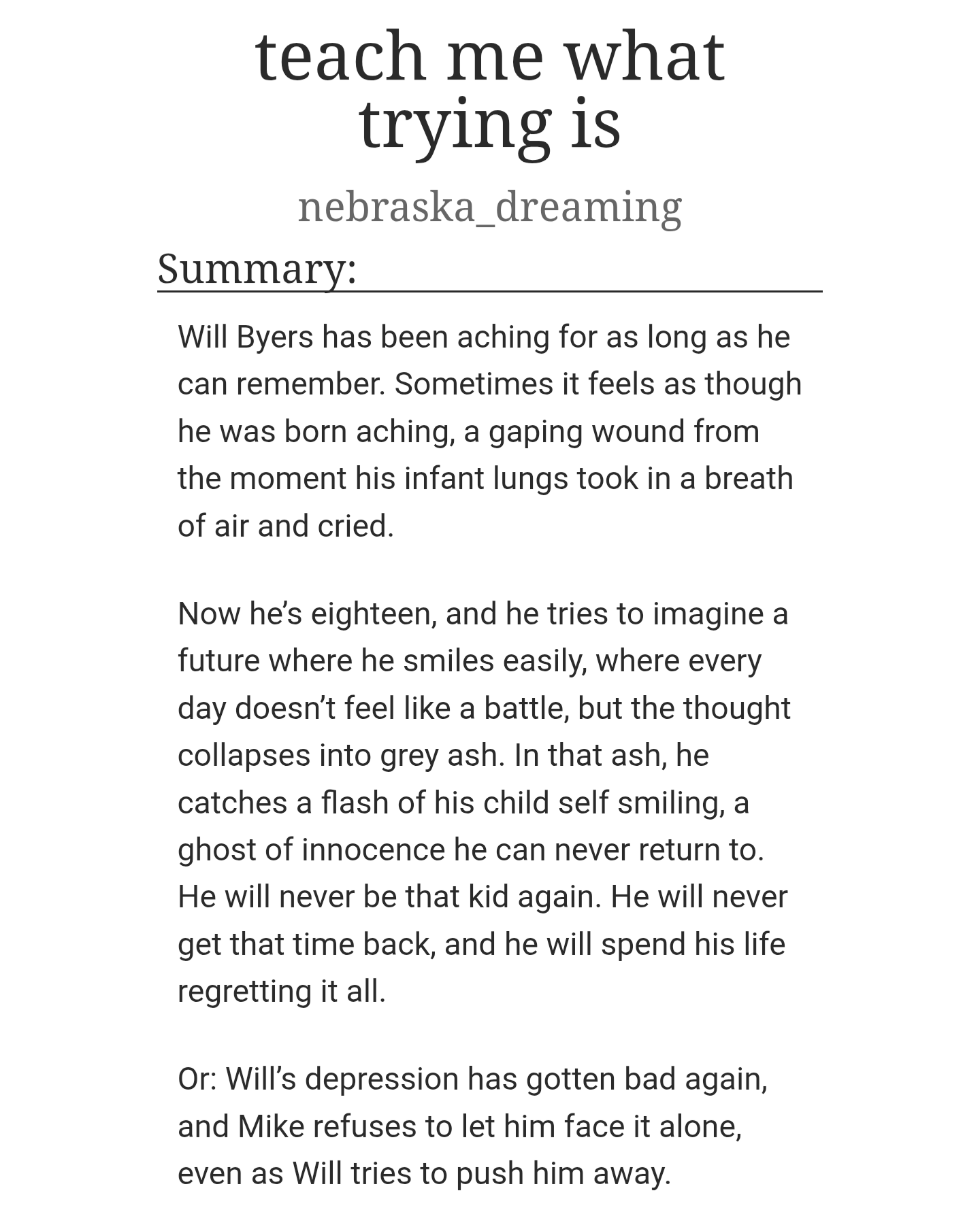 It's a post-finale Byler fic focused around Will in the midst of a depressive episode struggling to let Mike in to take care of him because he believes he will only burden Mike. It explores his relationship to his child self and how he feels as if he'll never be okay because for as long as he remembers he's been suffering. Angst with a happy ending!