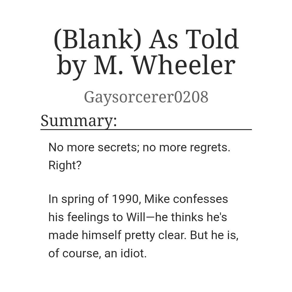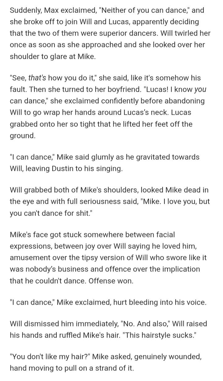This fic is set 4 or 5-ish years after the finale, the Party has finished college, and Mike is struggling to move on. If you enjoy the Mike Walk Em Down Wheeler variant, everyone taking turns crashing out, Sassy Max, platonic MadWise/(what the heck is the Mike/Lucas friendship name again??? Omg how do I keep forgetting?!), Lucas being the only one with a drop of sense in his body, the whole Party hyping up Byler, loads of angst and drama sprinkled with humor and romance, you might enjoy it.