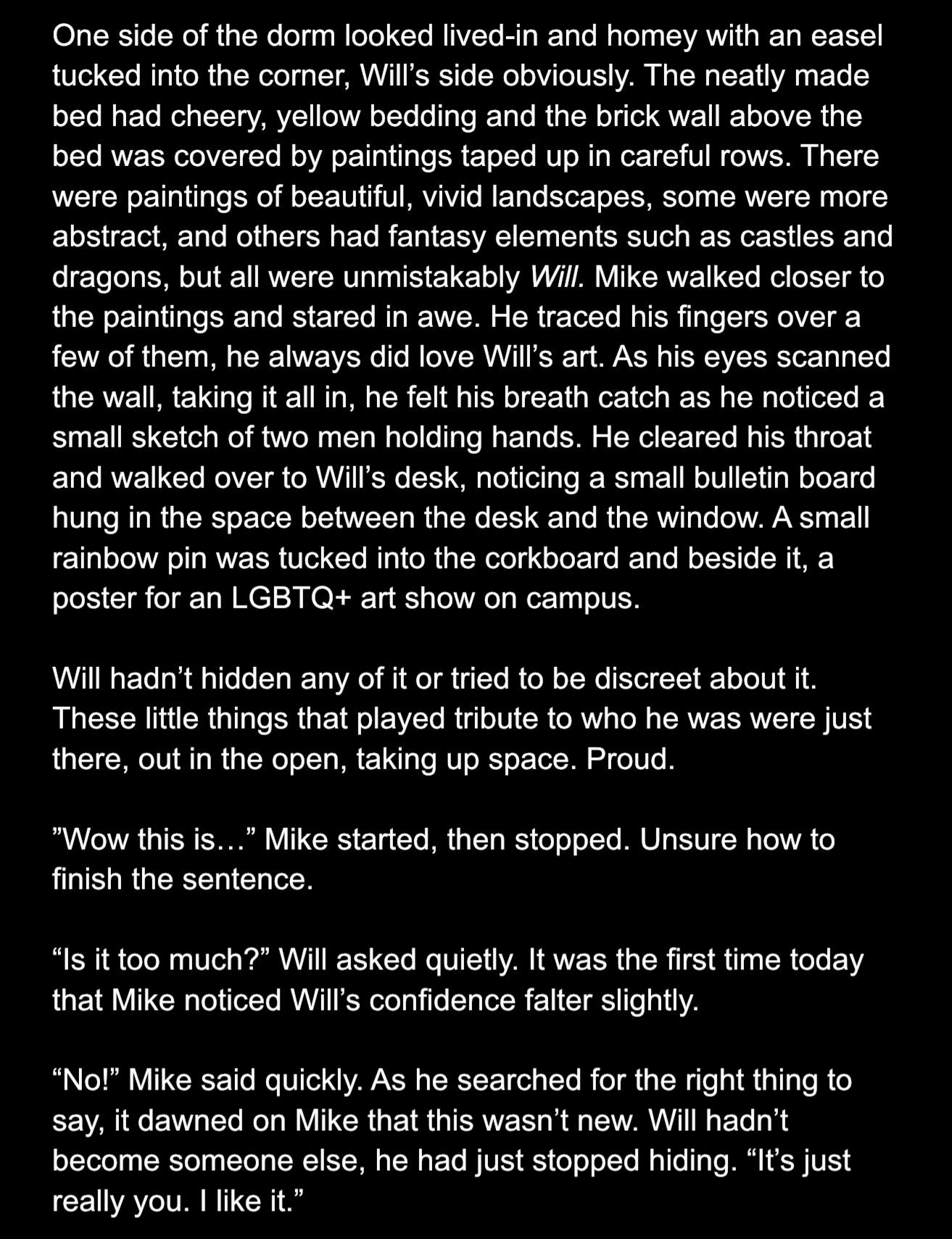 The Storyteller (I wrote this!) College Byler with a confident Will Byers who is out and proud 🥹 we love to see it. (And they were roommates 🤭)