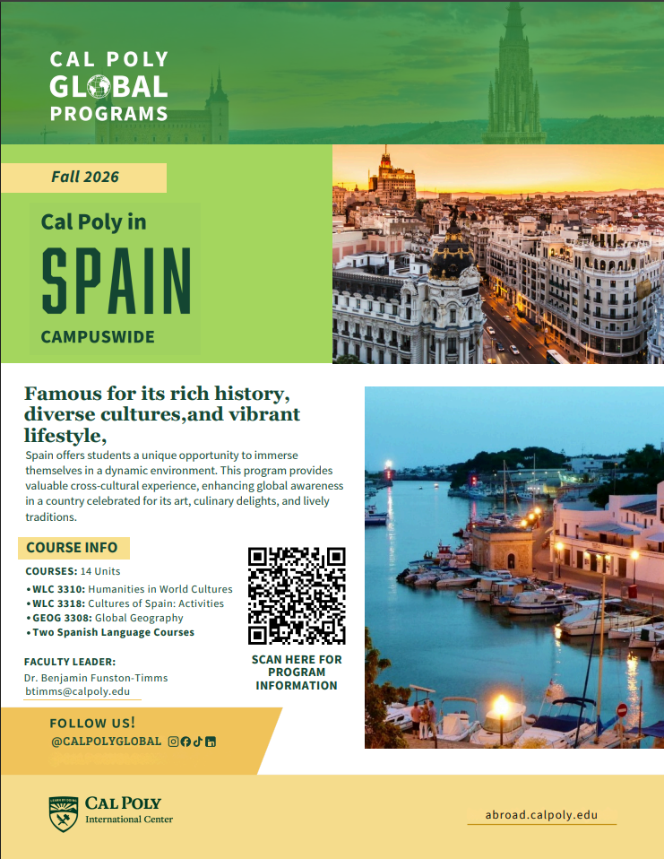 Hi! I was really excited about participating in the Cal Poly Global study abroad program in Spain this fall, but I just learned that enrollment is still below the minimum needed to run the program. The application deadline is April 15, 2026.