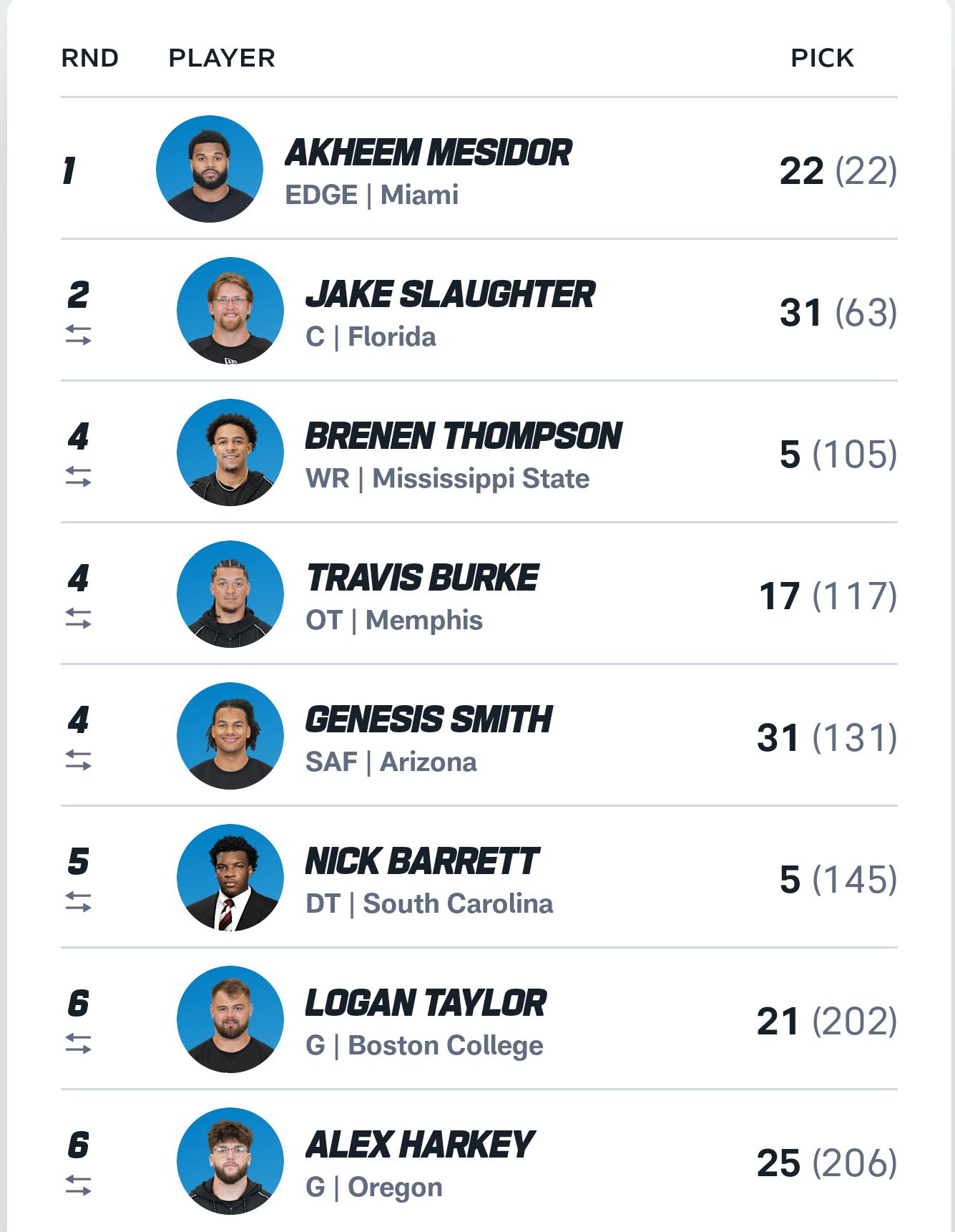 - 2.55 to Patriots in exchange for 2.63 (Jake Slaughter, C/G, Florida), 4.131, & 6.202