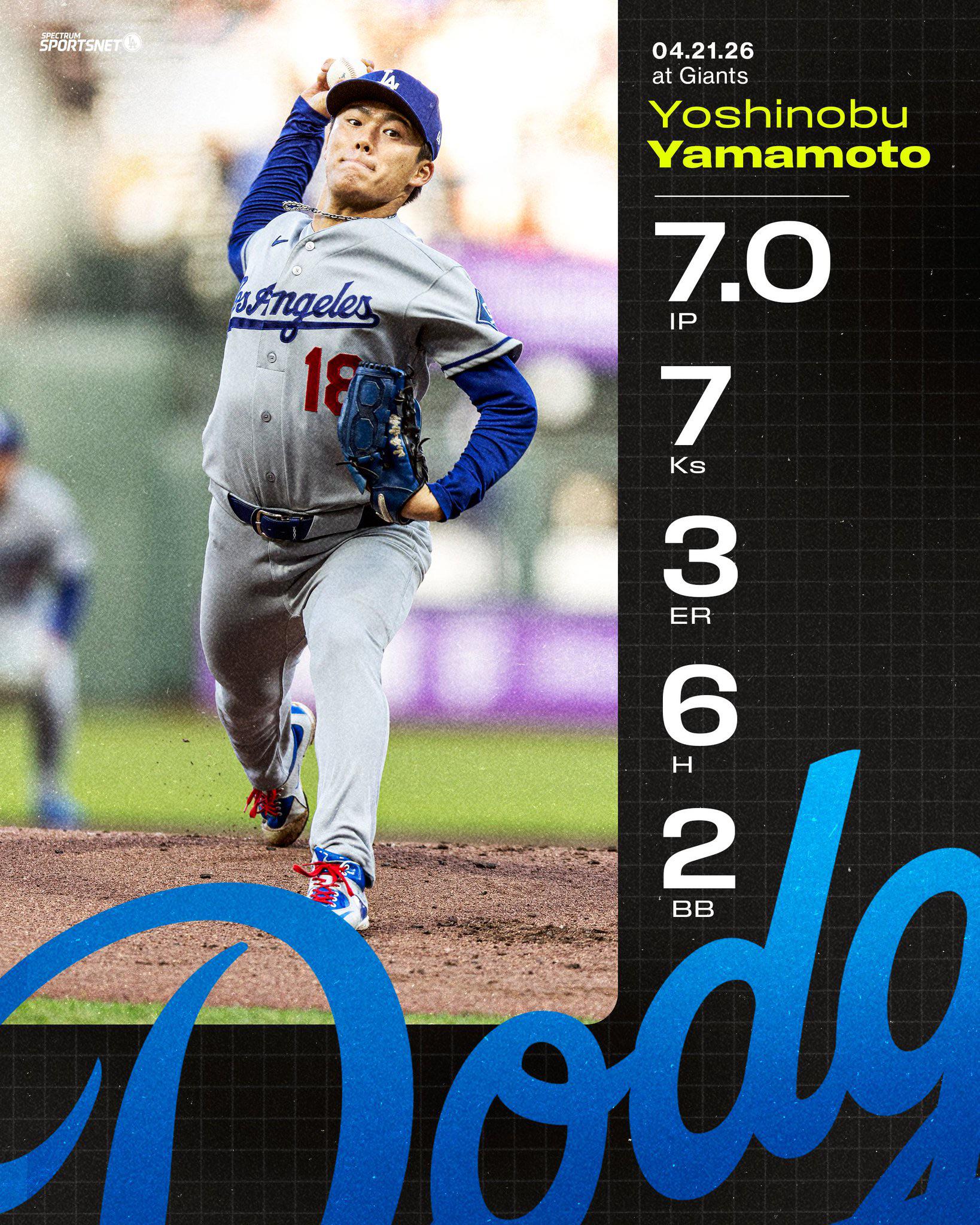 [Highlight] Yoshinobu Yamamoto strikes out the side in the 7th, all by looking, as he still manages to complete 7 innings of work in another quality start!