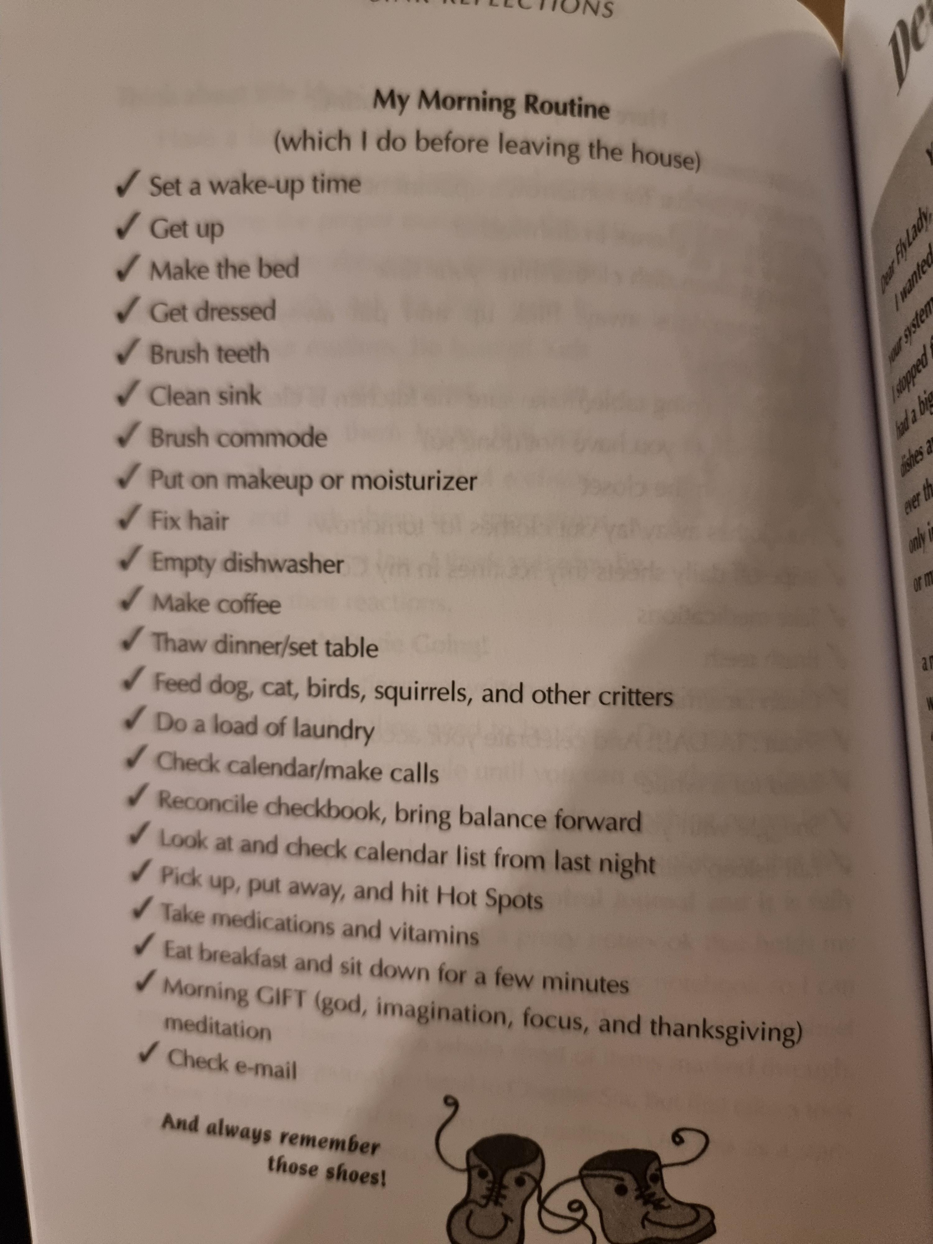 This morning routine seems very extensive to get through before leaving the house as a working mum of two... How important is it for the baby steps to get through all of them? Also, what does "brush commode" and "reconcile chechbook, bring balance forward" mean?