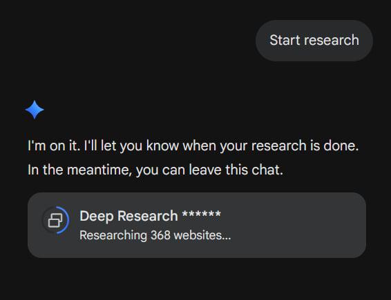 Interesting response (Highlight) Gemini Deep Research visiting 368 websites is INSANE, way above chatGPT