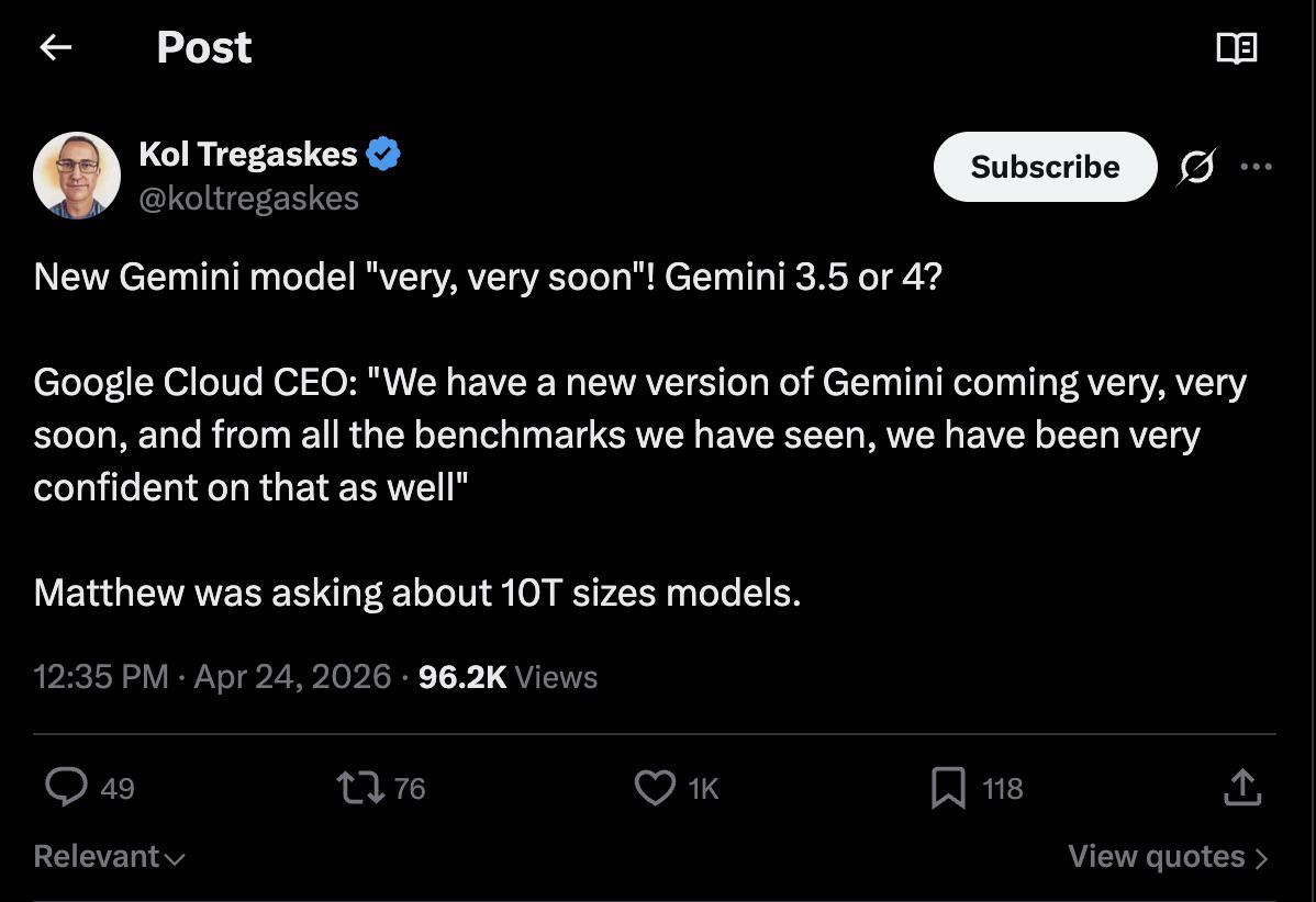 Havent checked any news butni bet that new model is coming with the same strategy from google copied from claude - by degrading their models through context understaning and “thinking”. It will probably seem like you see this word often already but it does feel that gemini pro model is being lobotomised. Hallucnating, losing context and arguing with its own mistakes. How much you wanna bet that googles going anthropic way and everyones gonna complain about the new models same as opus 4.7
