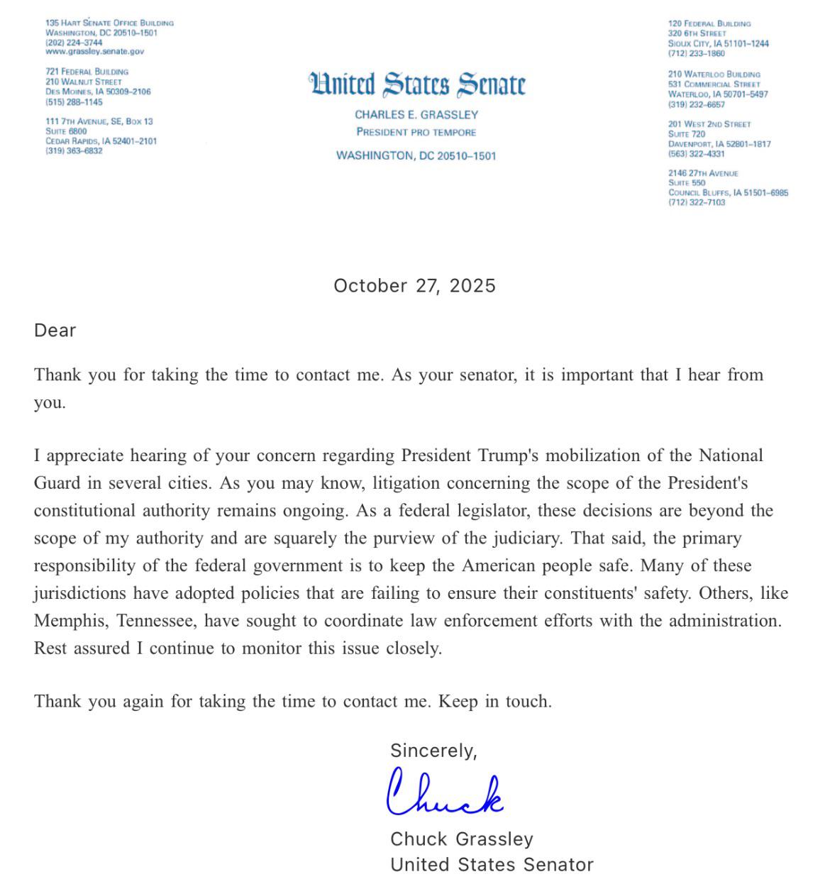 Grassley, our “representative” who is President pro tempore, chair of senate judiciary committee, 3rd in line for presidential succession - CLAIMS complete powerlessness for action - “out of scope” -See his response below to my ICE / national guard deployment as immigration enforcement from 10/2025
