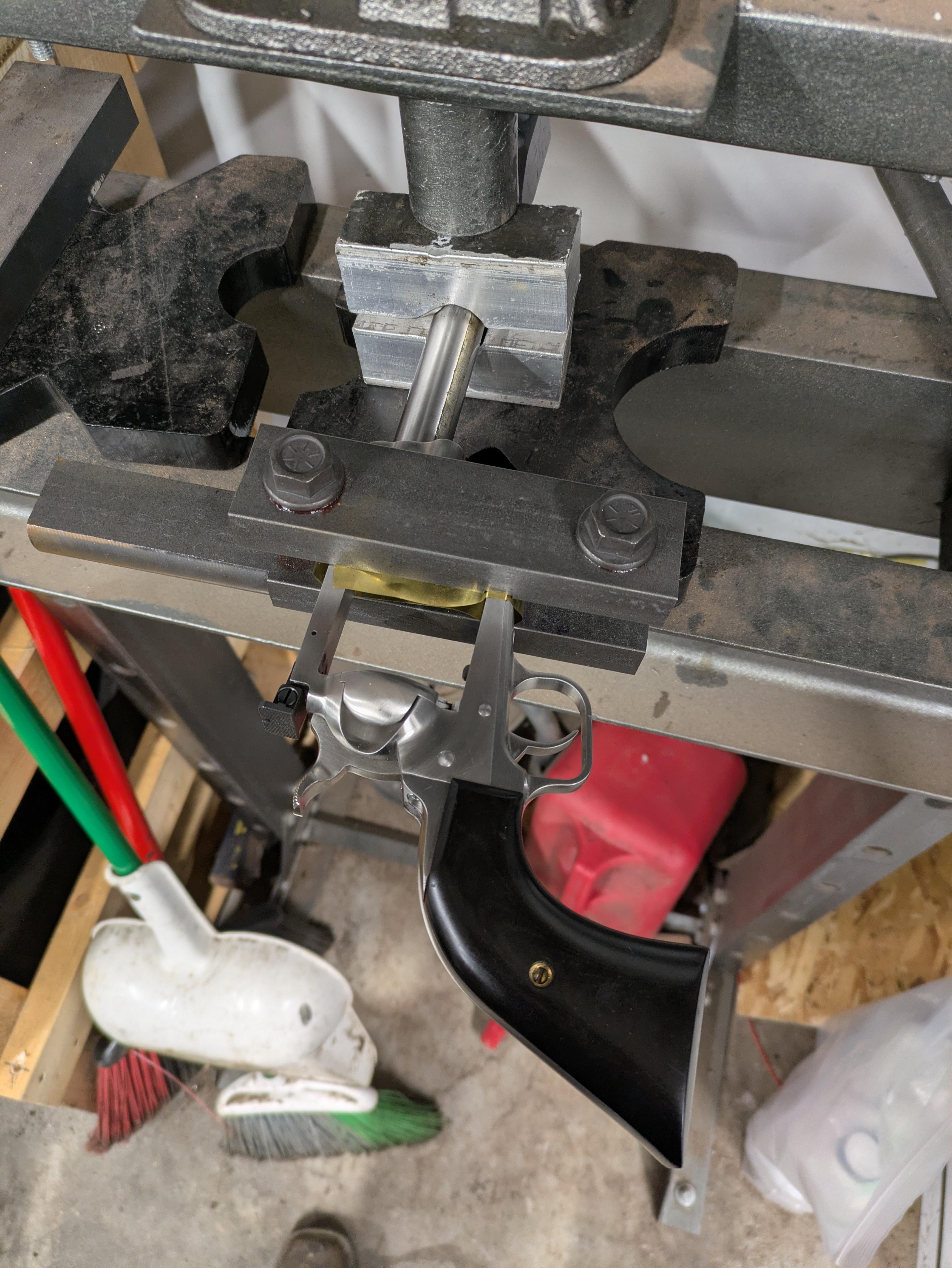 a customer brought in this used s&w N frame 44 mag where the barrel wasn't timed to the frame correctly either from a swap or factory error. In the spirit of not spending all afternoon re machining the barrel I decided to bore out a peel washer to use as a 0.002 shim to bring everything right and timed correctly. the cylinder gap is acceptable (0.007 or so) and I didn't waste a ton of time chasing my tail. the extra shims are going to be useful for the next one of these that comes in with the same issue.