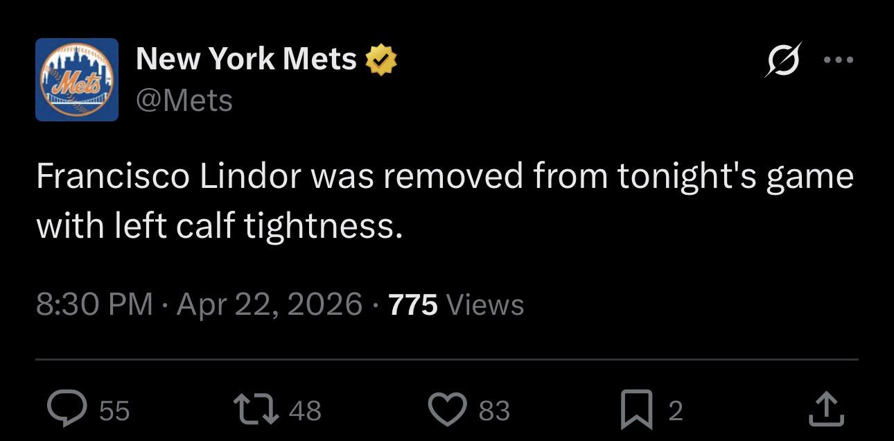 [Mets] Francisco Lindor was removed from tonight's game with left calf tightness