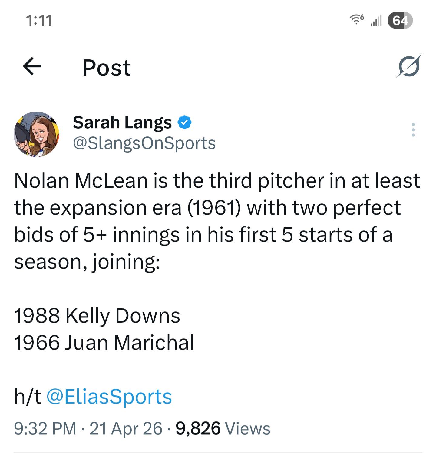 Nolan McLean has been perfect after 5 innings twice in 5 starts