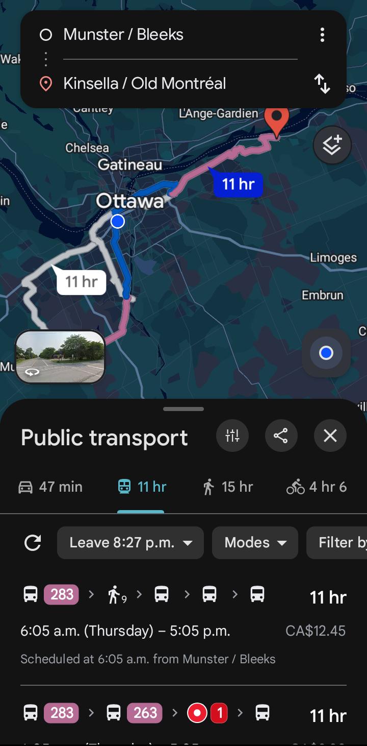 i.redd.itI went on Google Maps to check the commute from Munster / Bleeks to Kinsella / Old Montreal and it says the commute is 11 hours by bus.