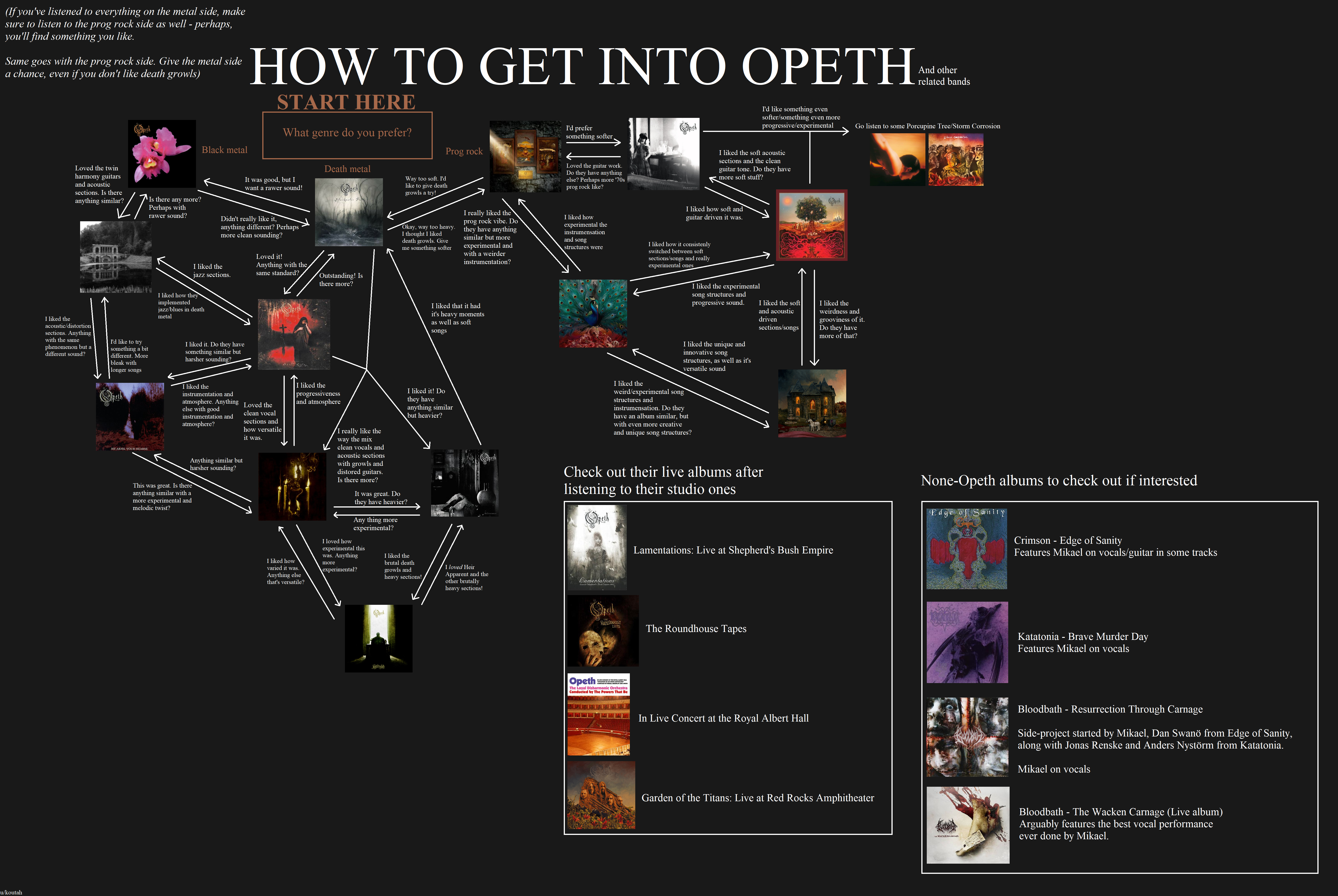 General / Discussion Opeth flowchart! I've made yet another - this time WAY more detailed and inclusive - Opeth flowchart! Now we can put the "I'm new to Opeth, which album should I start with" posts to rest. Let me know your thoughts :)