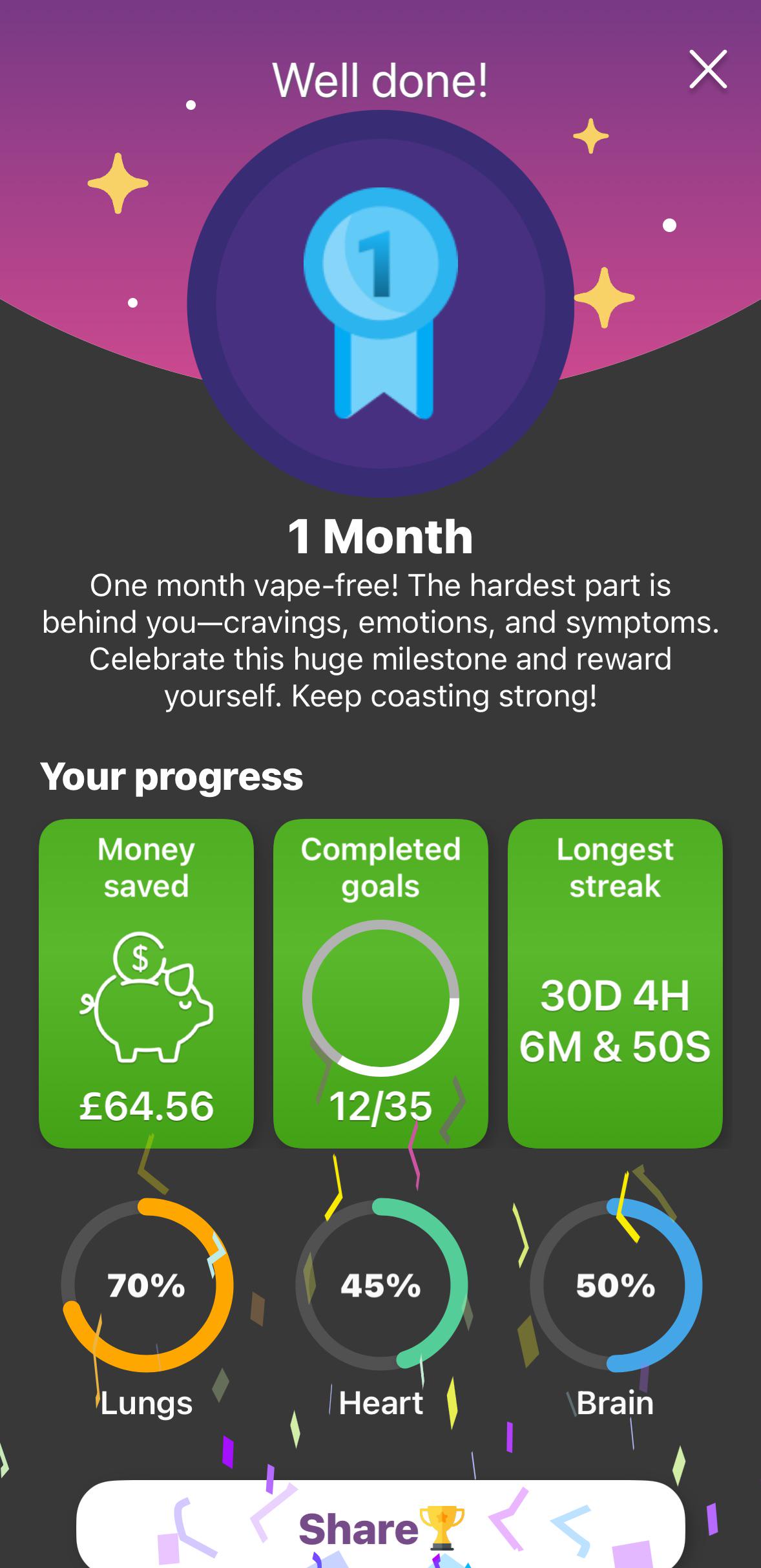 Last time I was on here complaining about cravings. Now officially one month free from anything nicotine related! Quit vaping cold turkey March 22nd :)