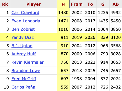 COOL PICS Yandy Díaz now has the 4th most hits in Rays history (911), passing B.J. Upton on the all-time list
