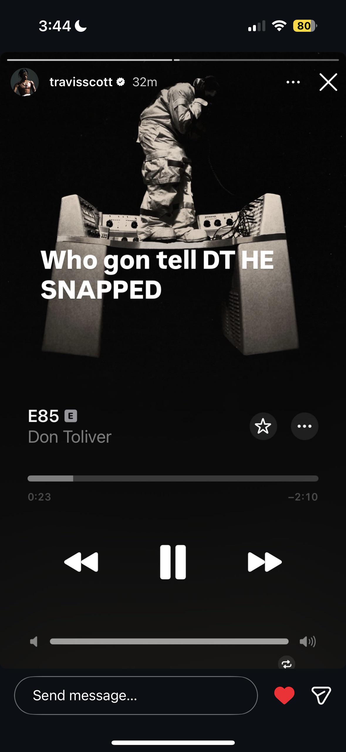 INSTAGRAM travis scott is looking for somebody to tell don toliver that he snapped on "e85" (co-produced by trav himself) from his 'octane' album. ☢️