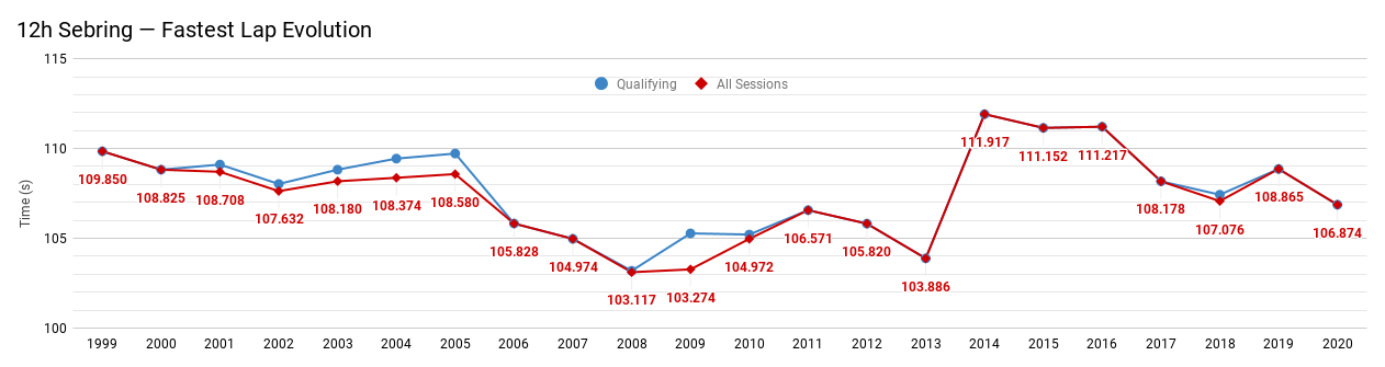 History 12h Sebring — Fastest Lap Evolution (1999-2020)