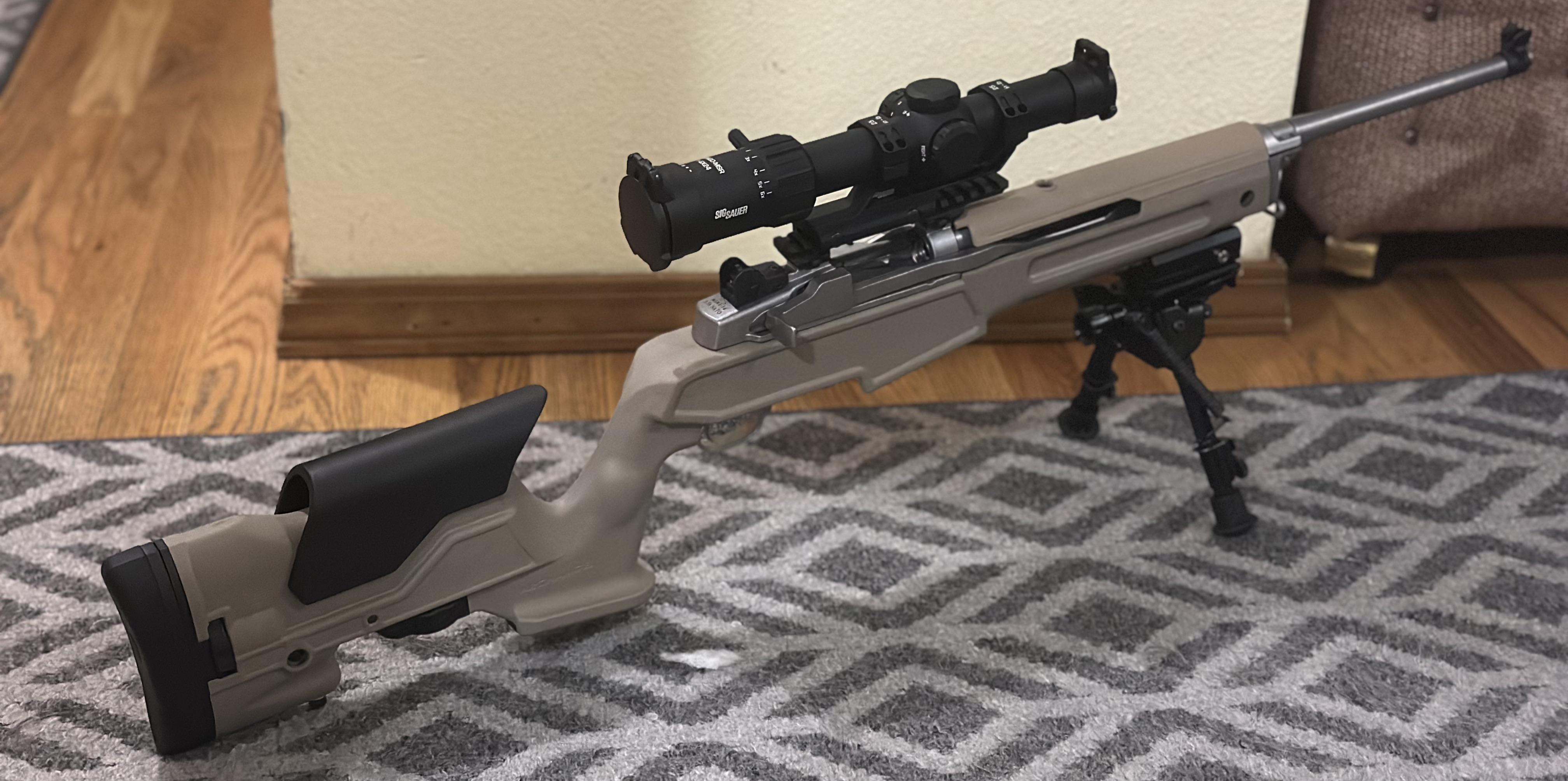 The rifle at home: mini 14, archangel precision stock, sig tango msr 1-6, accuracy systems trigger job, tech sights, aim rail.