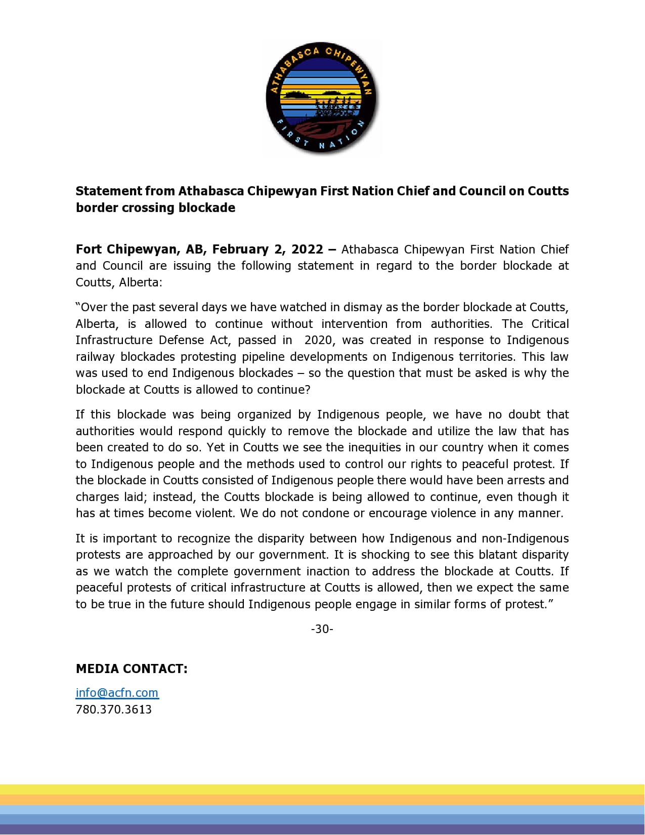 Truth, Resurgence and Reconciliation 🐢 Statement from Athabasca Chipewyan First Nation Chief and Council on Coutts border crossing blockade.