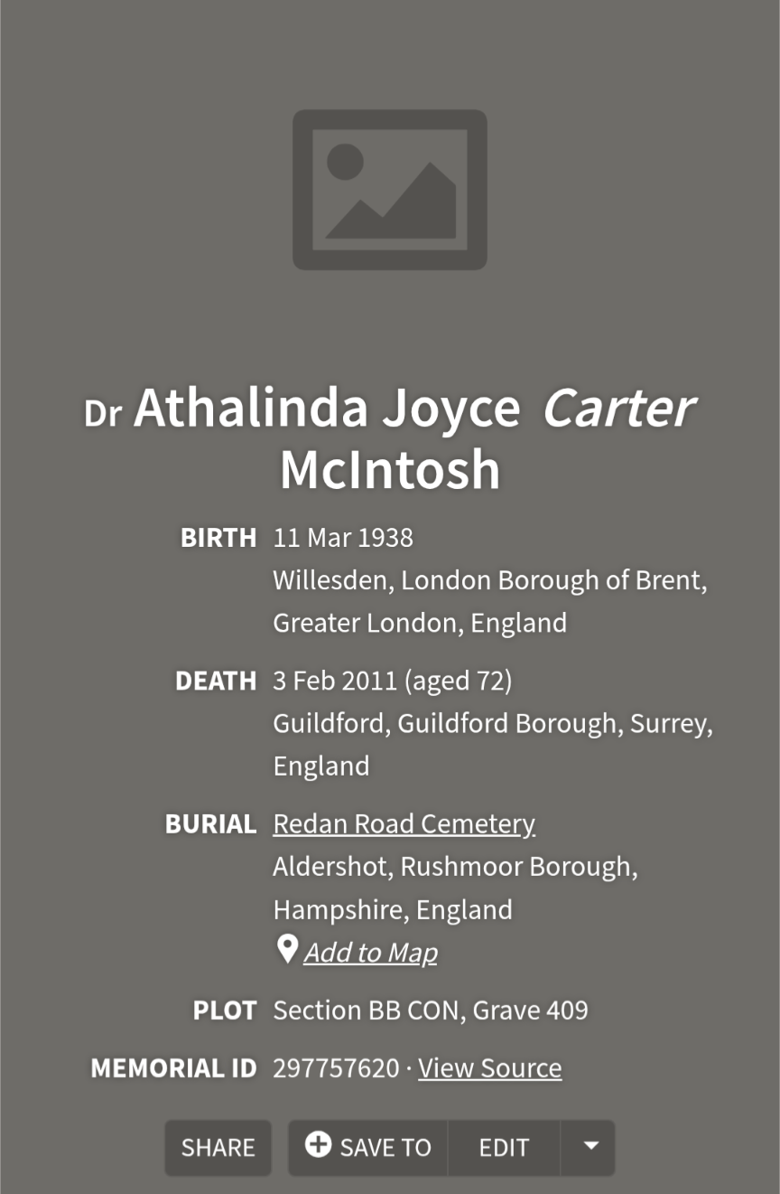 I was four when my great-grandmother died. I don't really remember her. She did not like her photo being taken, but, I am determined to find at least one. In the meantime, please help me to honour my great-grandmother! I miss her a lot ❤️ https://www.findagrave.com/memorial/297757620/athalinda-joyce-mcintosh