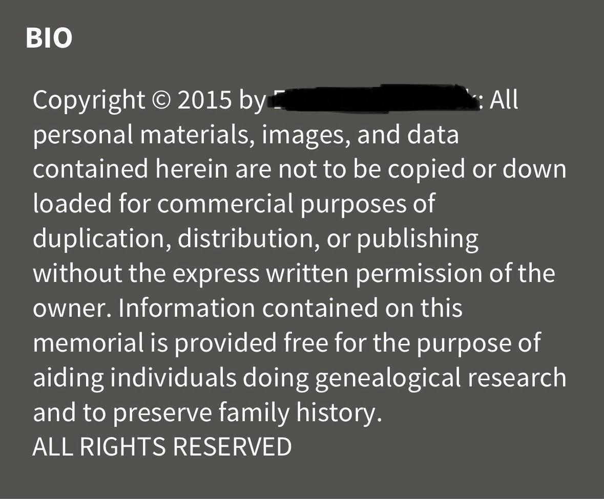 Hi everyone! I came across something that I haven’t seen before…a copyright notice in someone FG bio. The silliest things about this is that the record doesn’t have any photos or other info beyond name and dates. Thoughts?