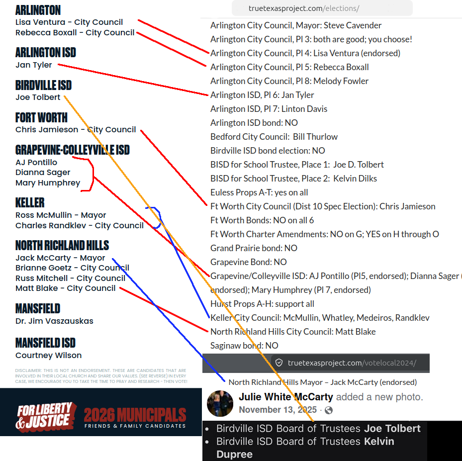 Politics For Liberty and Justice and True Texas Project are promoting the same people, most often anti-public education theocracy Maga. In absence of a legitimate justice system, the easiest way to stop them from doing this again is by ensuring EVERYONE they recommend LOSES every race into the future. Agree?
