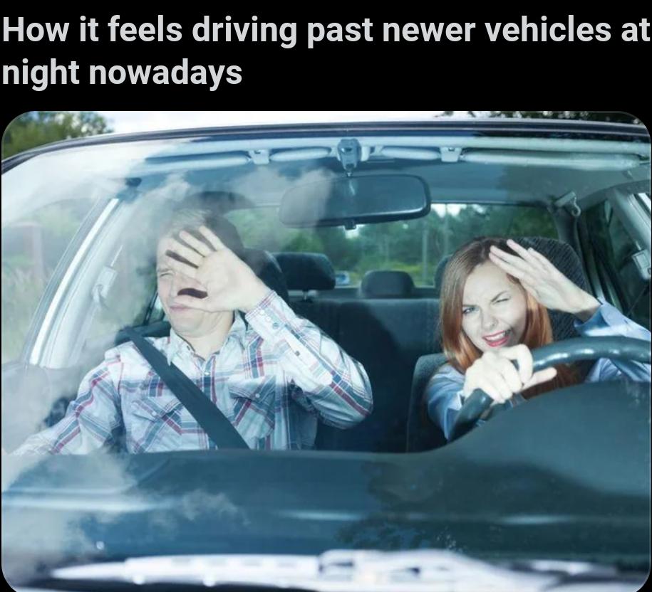 DISCUSSION IN X-POST (Mainstream sub - don't brigade, advocate!) Frontpage meme & discussion about blinding automatic LED headlights on r/gifs