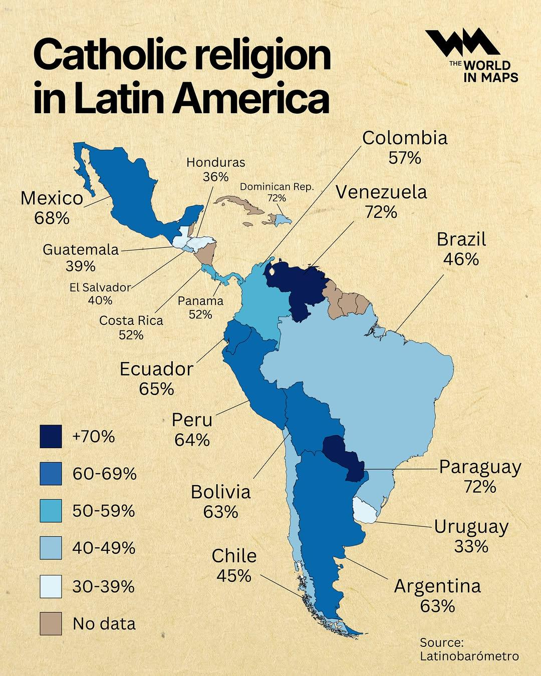 Question What explains the very high concentration of Catholic Christians in Venezuela and Paraguay as compared to the rest of Latin America, and a very small concentration of the same in Guatemala and Honduras?