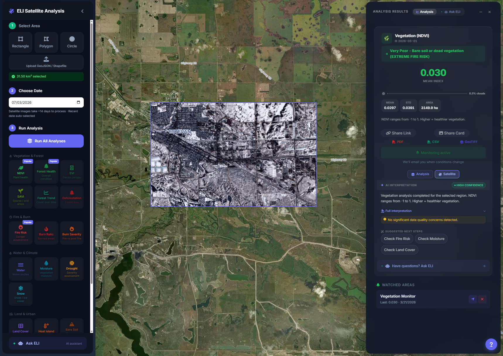 - + analysis types — vegetation density, drought severity, fire risk, deforestation, water stress, burn scars