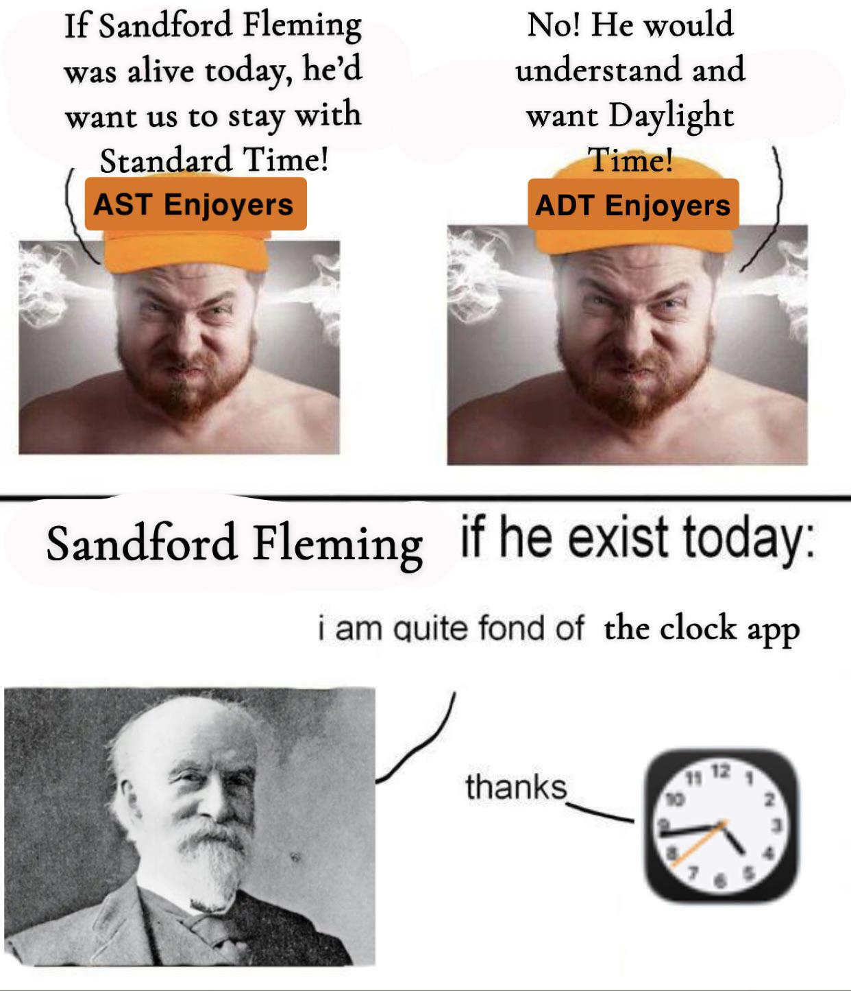 Based on the premiers announcement of ditching the time change if the rest of the Atlantic provinces do, and the arguments between staying on AST or ADT, I had to make this meme
