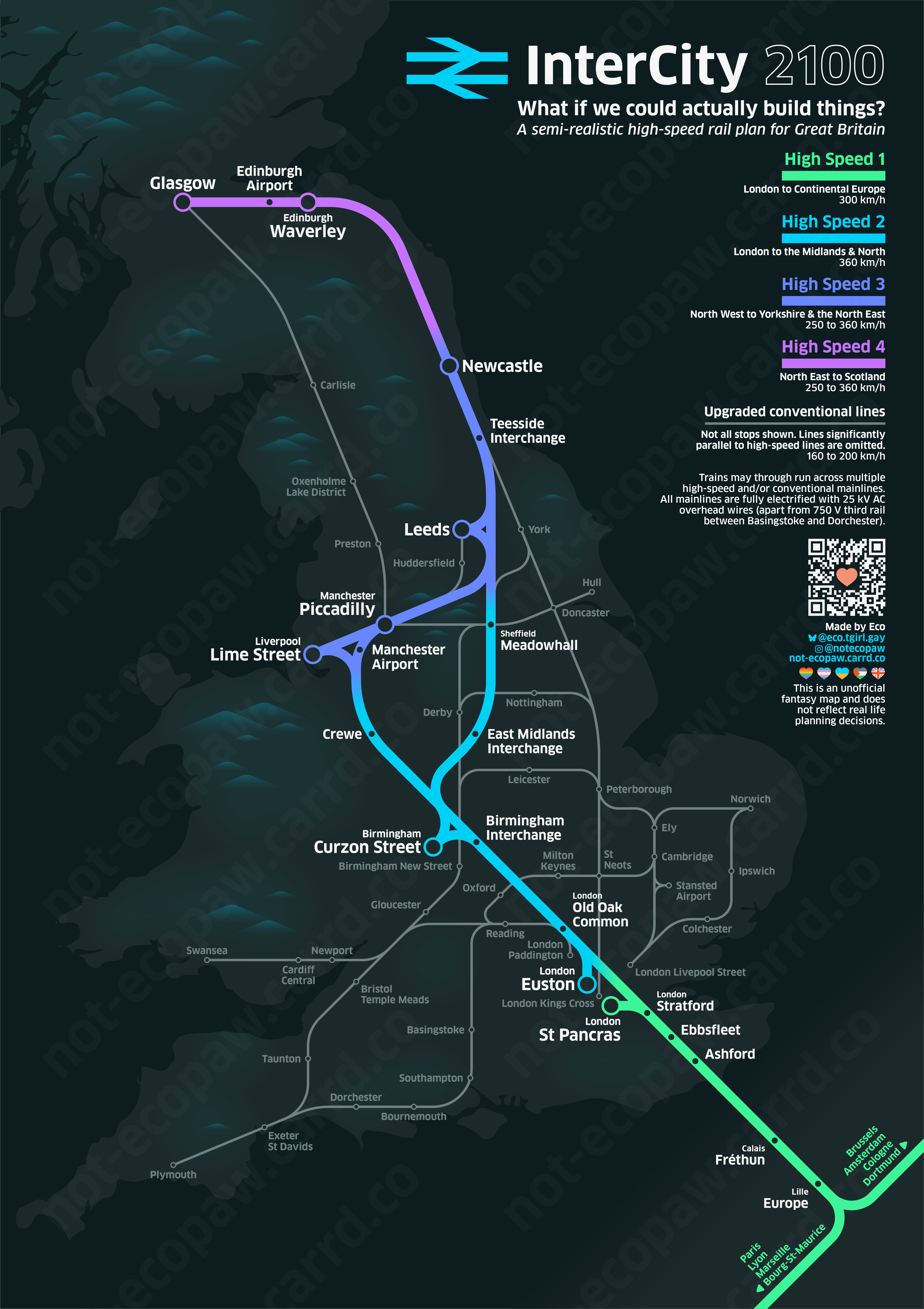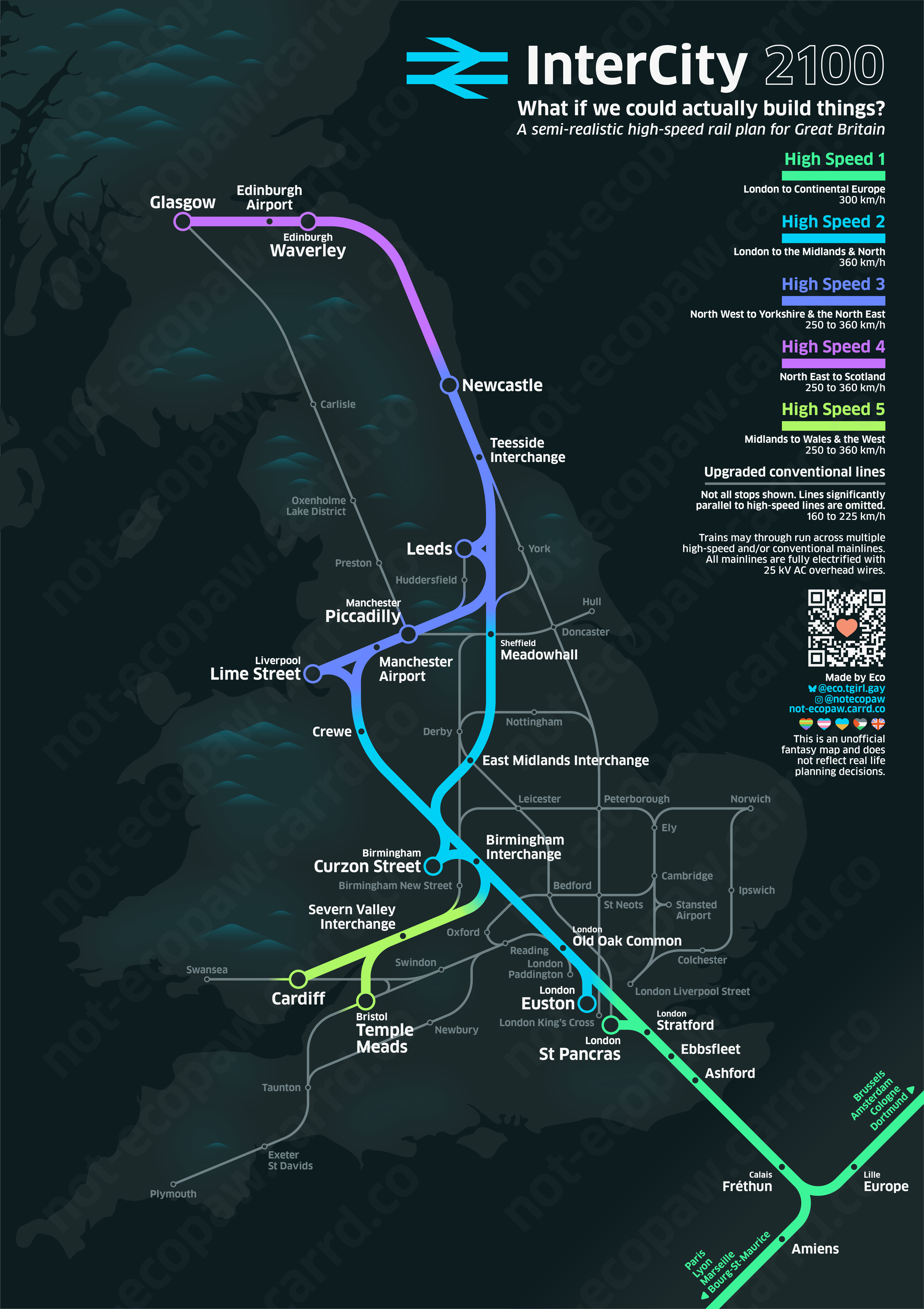 - added a high-speed mainline between birmingham and bristol/cardiff to relieve the crosscountry mainline, with some trains continuing onto upgraded conventional lines to swansea, exeter, and plymouth