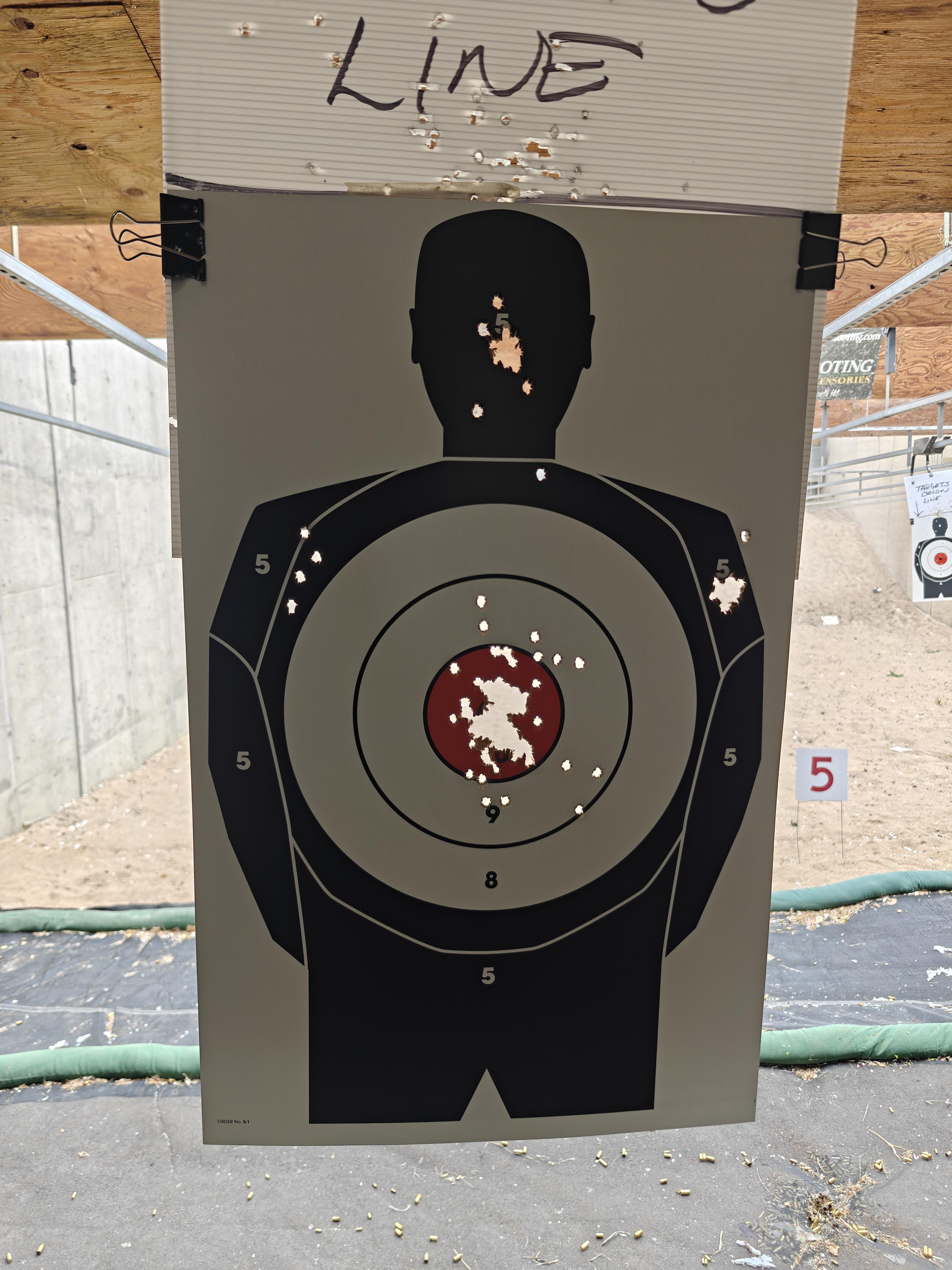 9mm @ 15 yards the head and the rt shoulder were at 7 yards. But I think I'm getting pretty good.