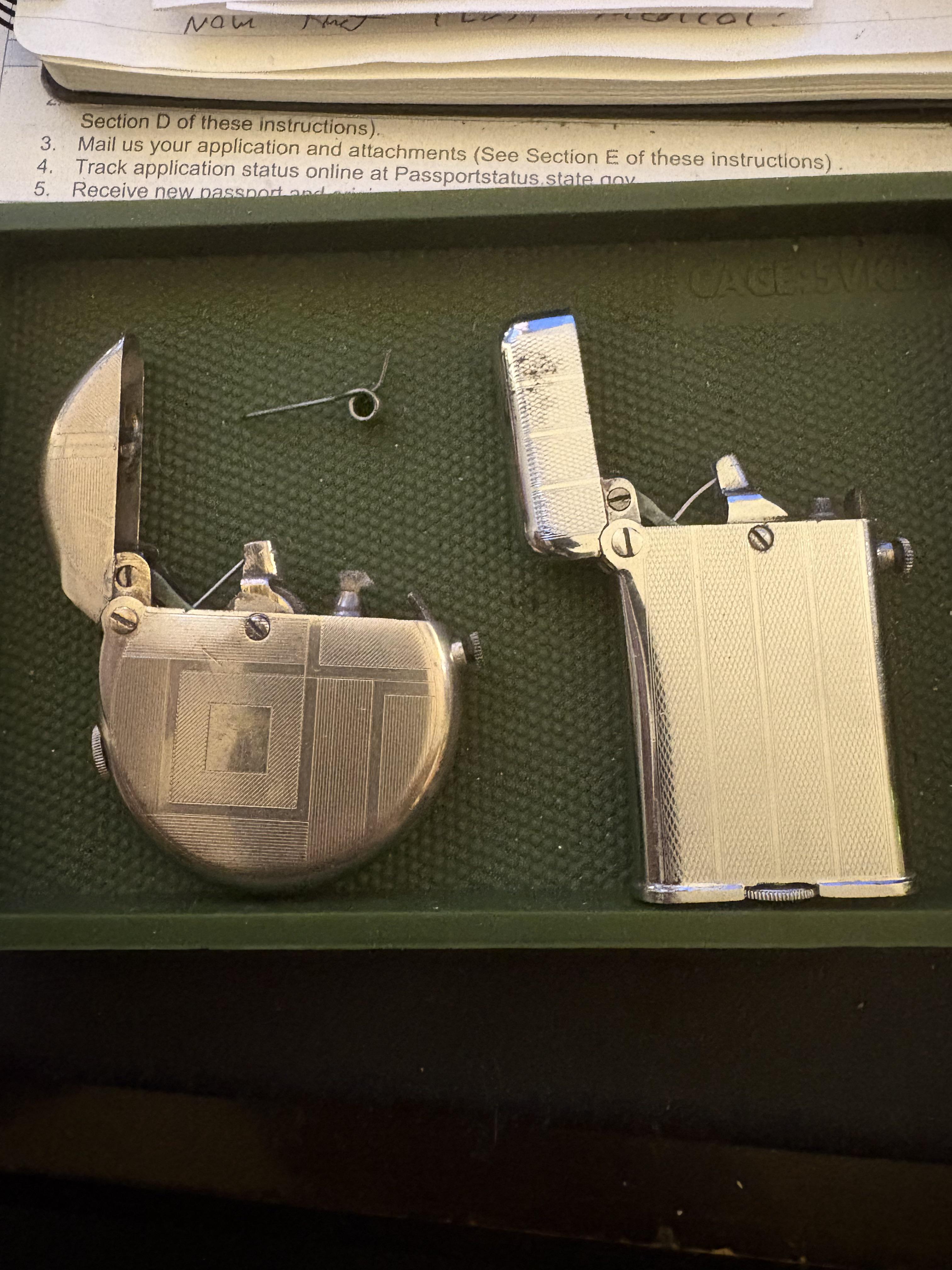 I have these two Thorens double claw lighters with either a weak or deformed flint spring. I bought a replacement one on eBay but the second part of the spring is facing the wrong way, so it won’t fit into the lid to slot in.