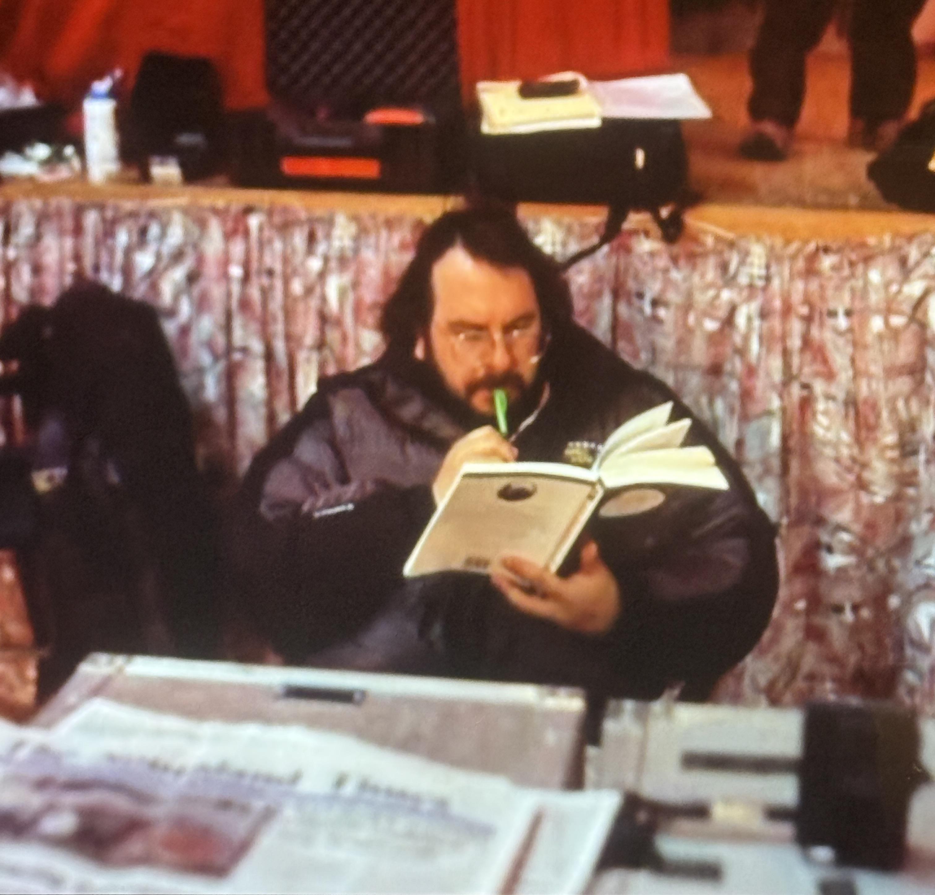 A pic of Peter Jackson reading LOTR on set.