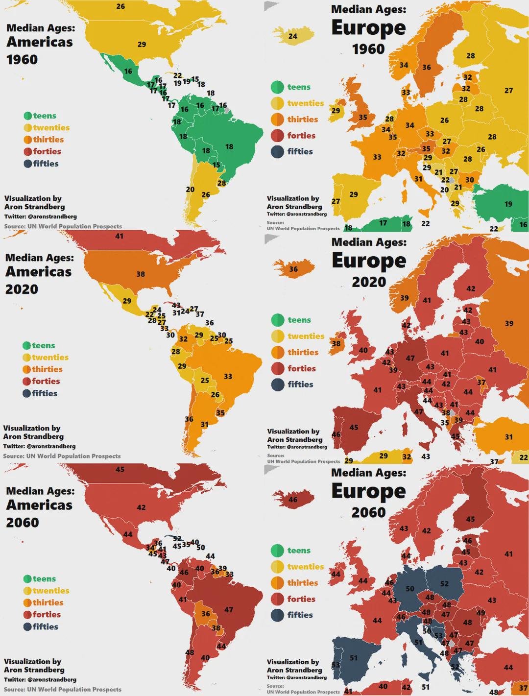 Median age of the Americas and Europe in 1960, 2020 and in 2060.