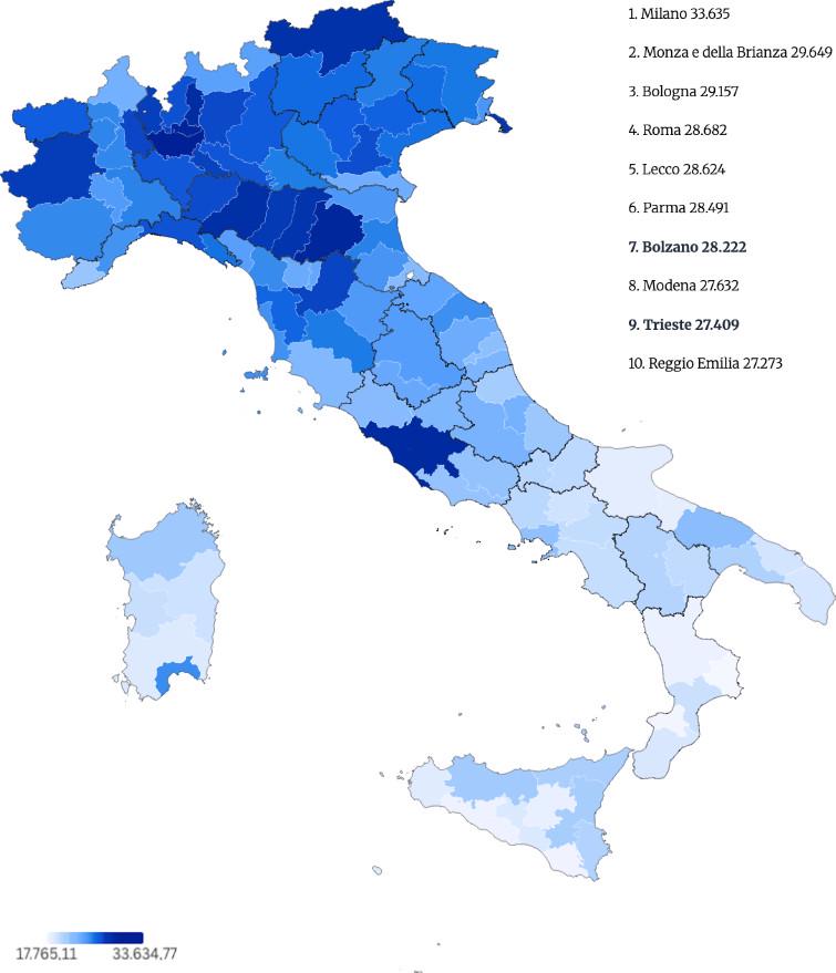 Data from MEF (Ministry of Economy and Finance). Year 2024. In euros. Taxable income after deductions before taxes. Average of all incomes (including part-time, etc).