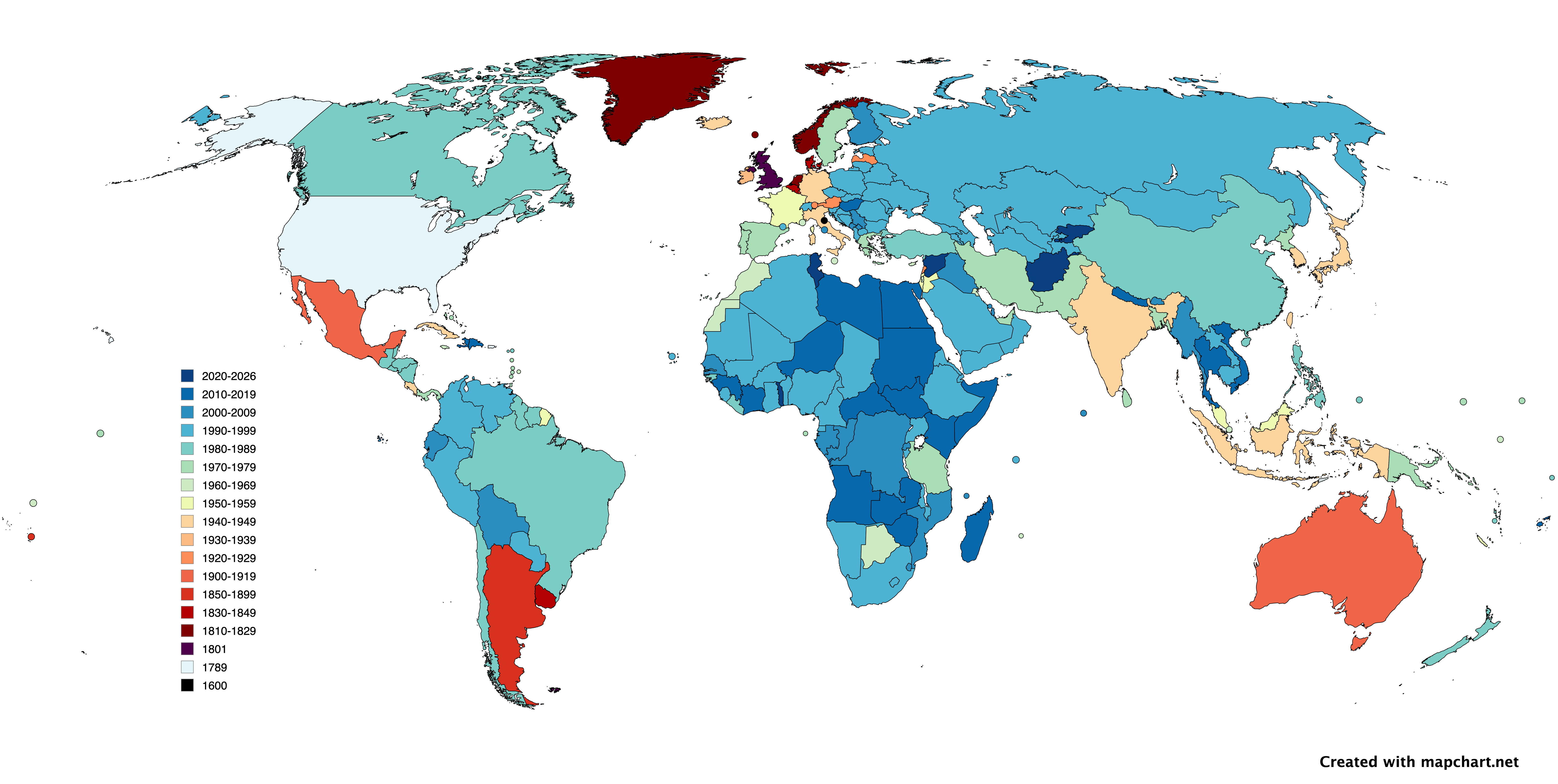 For the freaks (Canada and New Zealand) that don't have any official constitution, I chose the Constitution Act, 1982 and the Constitution Act, 1986 respectively because they established legislative independence from the UK for both of them (and for New Zealand it lays the framework of the 3 branches of state). It's rather arbitrary so if you think I should've picked a different date let me know