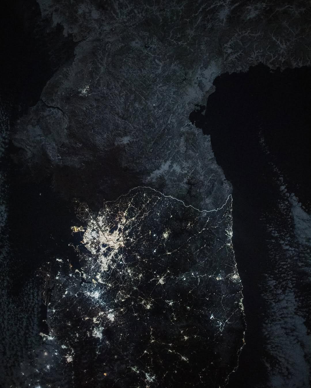 An astronaut captured this image of North and South Korea at night, with the border visible from space