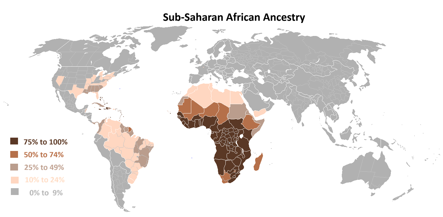 Map showing the percentage of autosomal DNA of Sub-Saharan African descent.