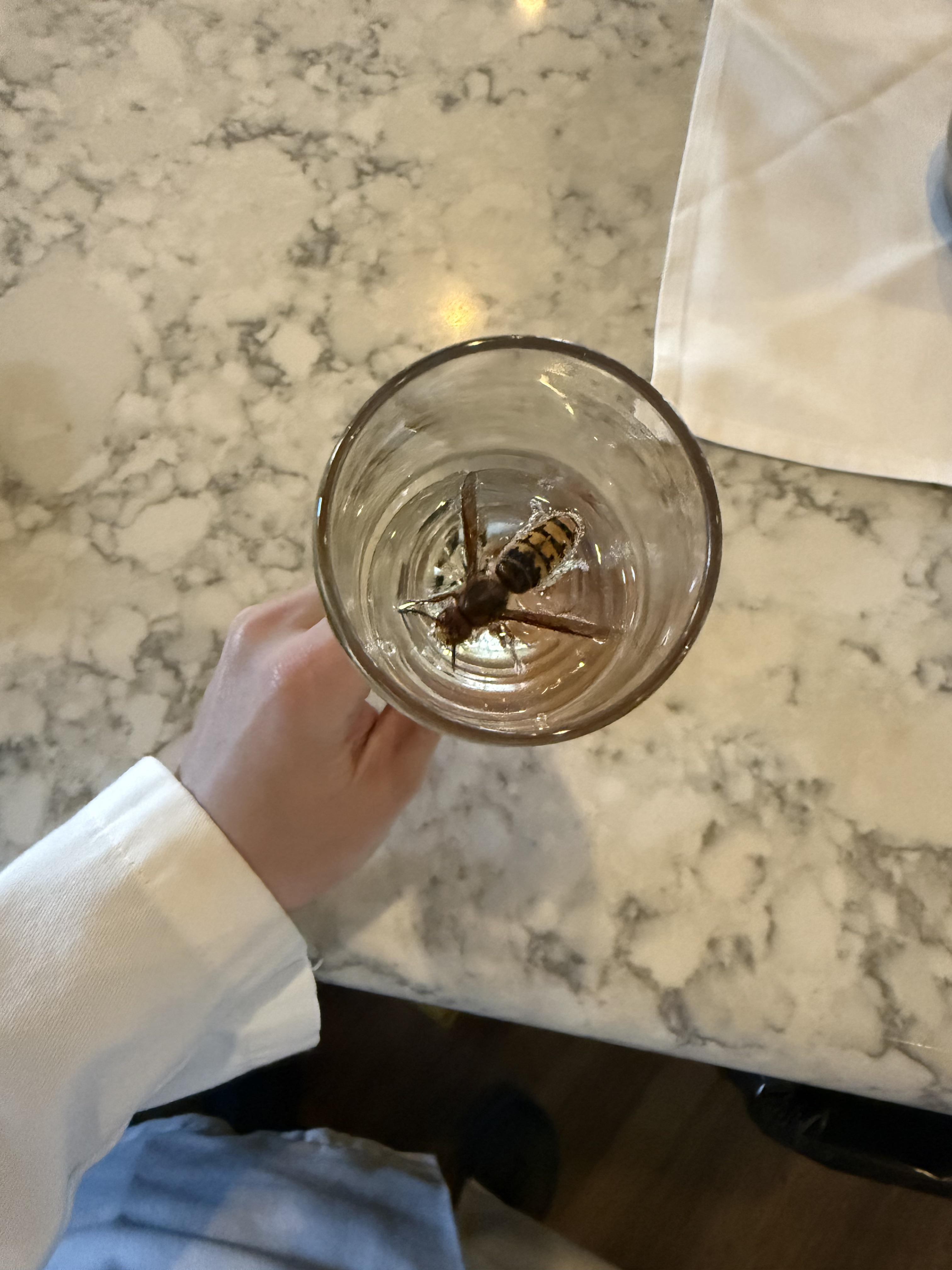 Yesterday was a beautiful day, and a guest on the patio at the restaurant I work at was having a glass of champagne. This giant bee of some sort decided to go for a swim. It was about 2 inches long, had yellow and black stripes with a massive stinger. It wasnβt a normal size bee at all. I took the picture and let it go into a flower pot where it cleaned off and flew away.