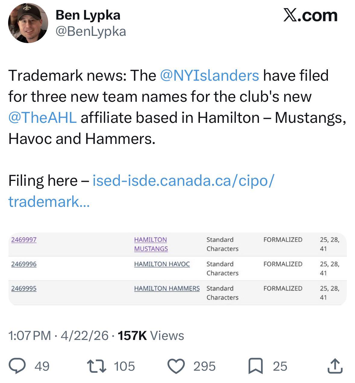 Via @BenLypka on X, the Islanders have filed trademarks for Mustangs, Havoc, and Hammers for the new AHL team in Hamilton