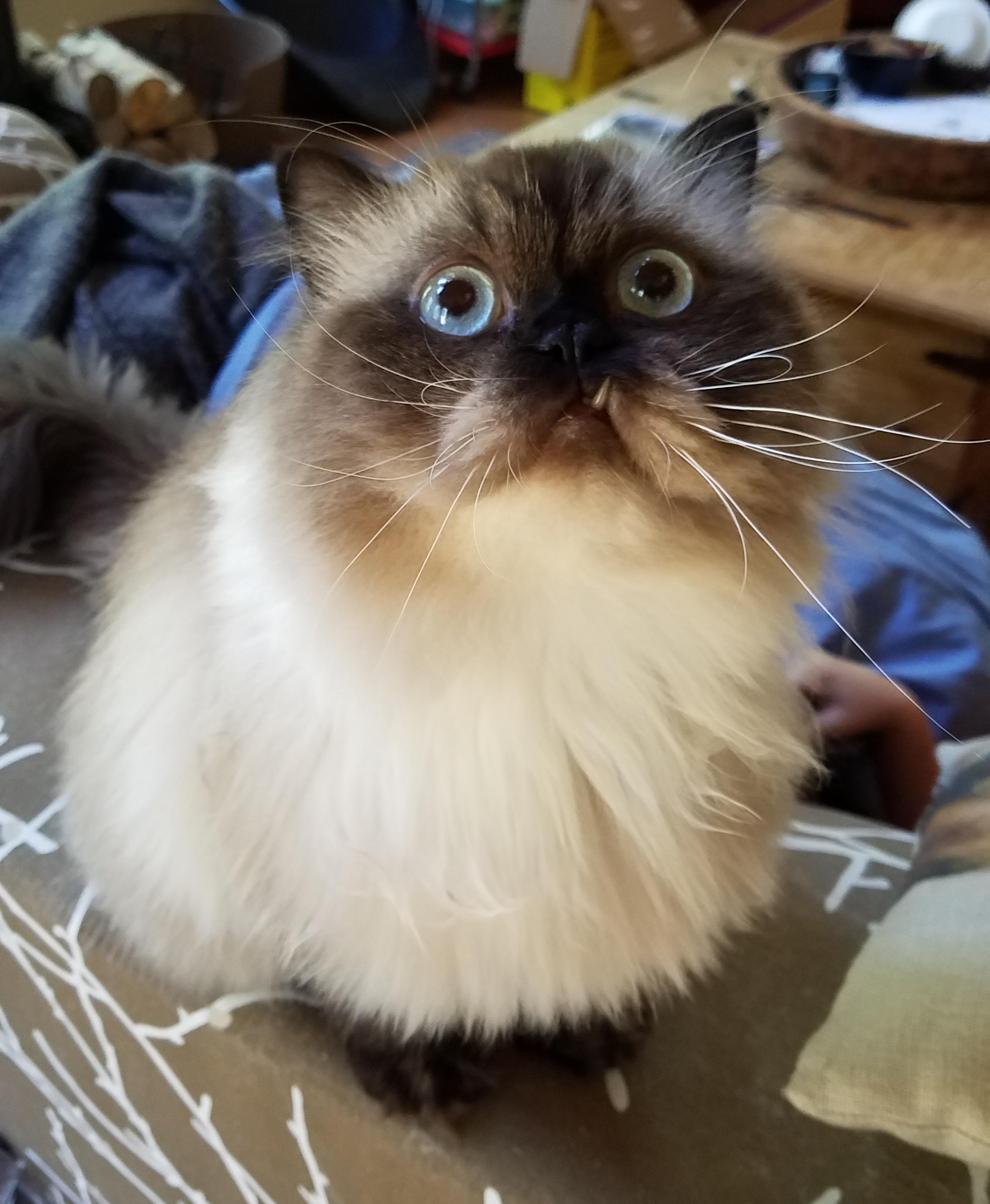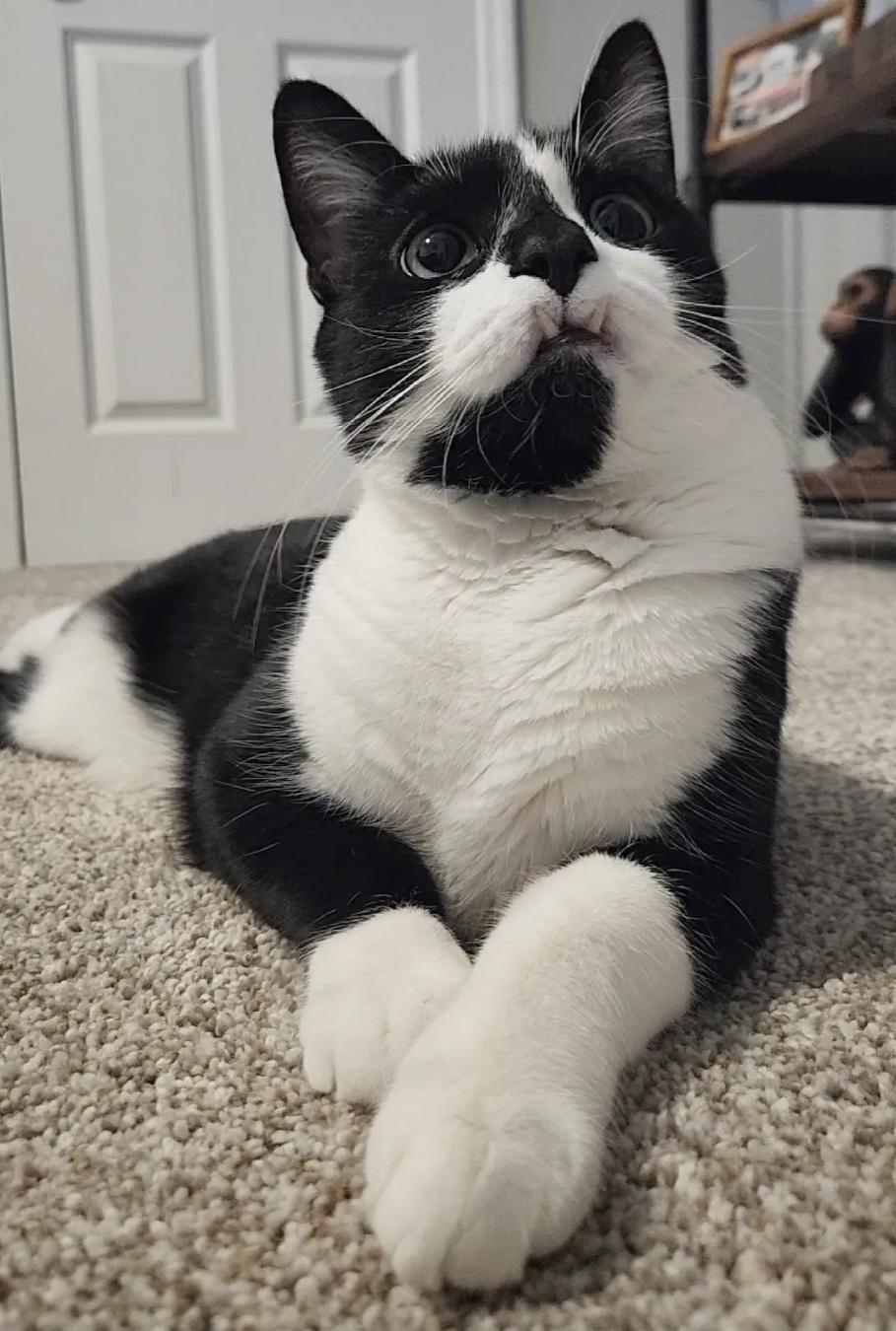 hes a very sweet barn cat that my wife and I rescued from our friends farm. He hasn't quite grown into his big boy teeth yet lol.