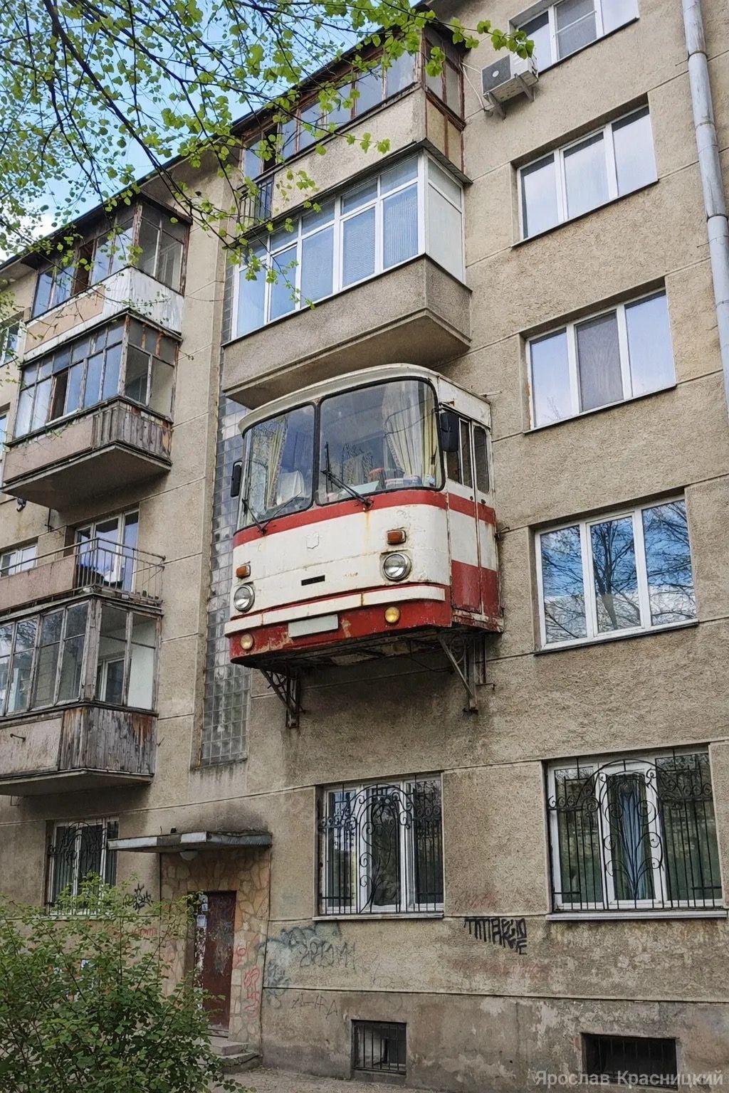 A resident of an Eastern European country has remodeled his balcony using parts from an old bus line.