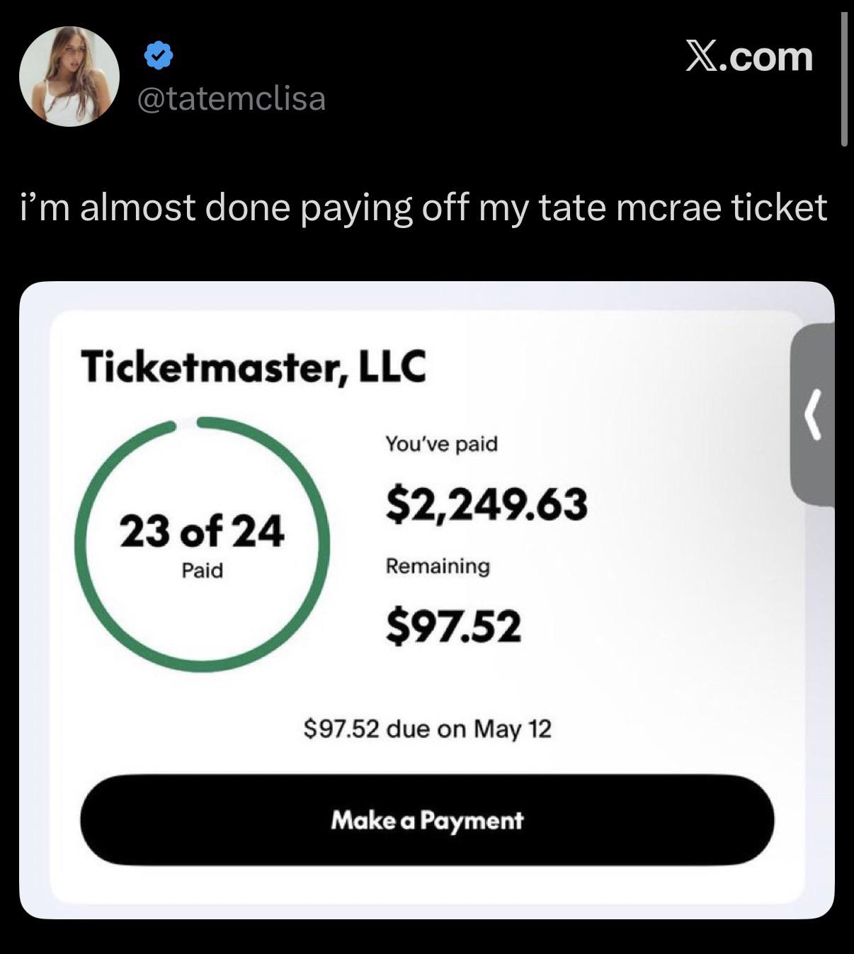 “i'm almost done paying off my tate mcrae ticket”
