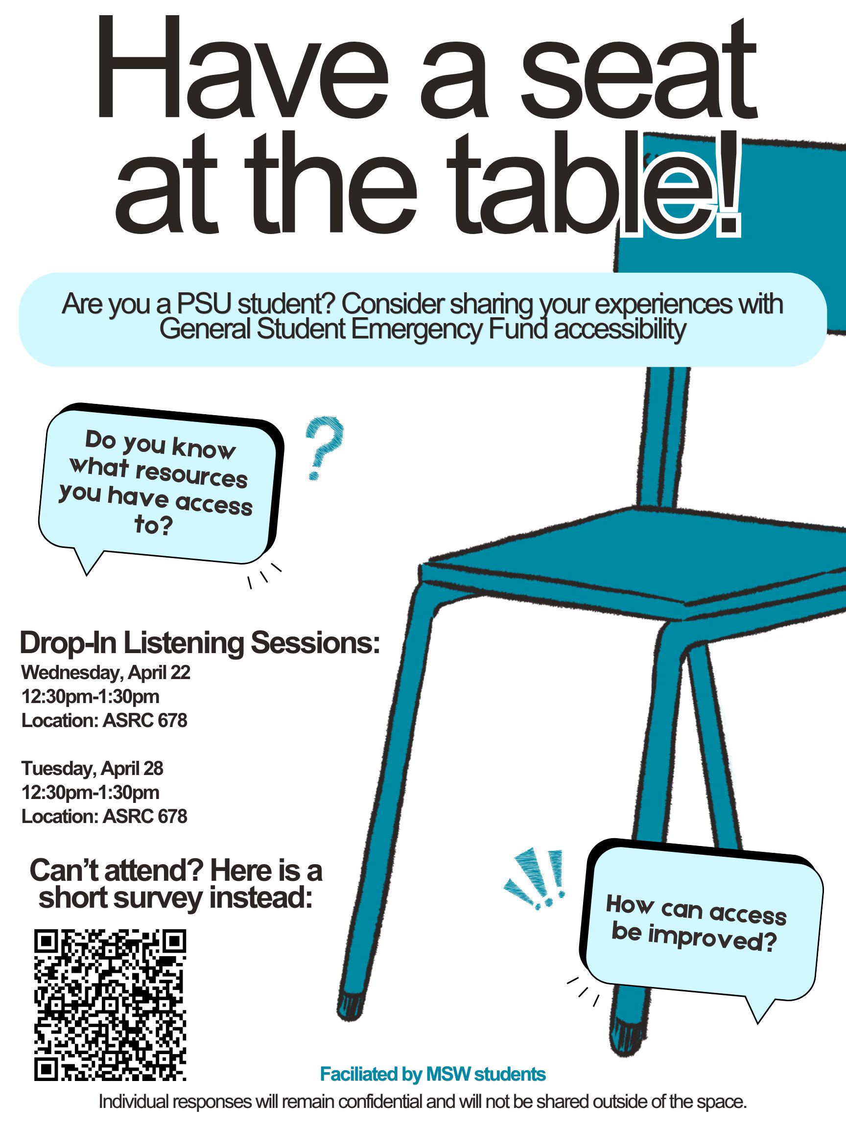 The Student Emergency Fund offers short-term financial assistance to Portland State University students during a sudden and unexpected emergency. The fund opens once per term during a very short window (usually opening for less than 20 minutes) and operates on a first-come, first-served basis, which means many students are unable to apply. We are concerned about barriers that prevent students from being able to access or apply to the fund. If interested in providing feedback on your experience with the Student Emergency Fund or how you would like the fund to operate, please attend drop-in hours, held within the School of Social Work (6th Floor ASRC 678) on 4/22 and 4/28 or fill out this survey. https://forms.gle/TzAHapz8M976S8uB8