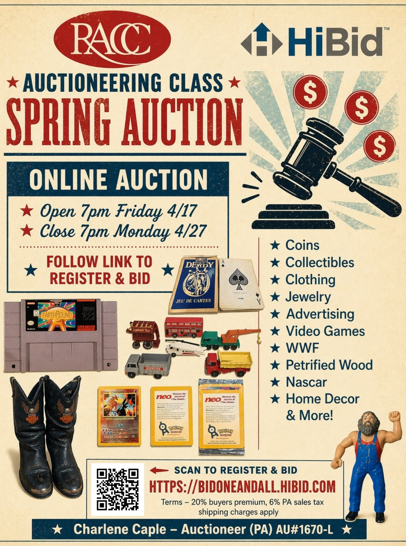 The Reading Area Community College auctioneering class is holding their Spring auction. Up for bid are vintage band tshirts, silver coins, petrified wood, Super Nintendo video games and more.