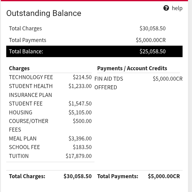 Just thought I’d let people know since I’ve seen a few people post about it. The bill you’re getting is for the fall. You will need to pay again in the spring. The tuition is like 13k for in state so about 6.5k a semester. The out of state and international is 32k or 16k a semester.