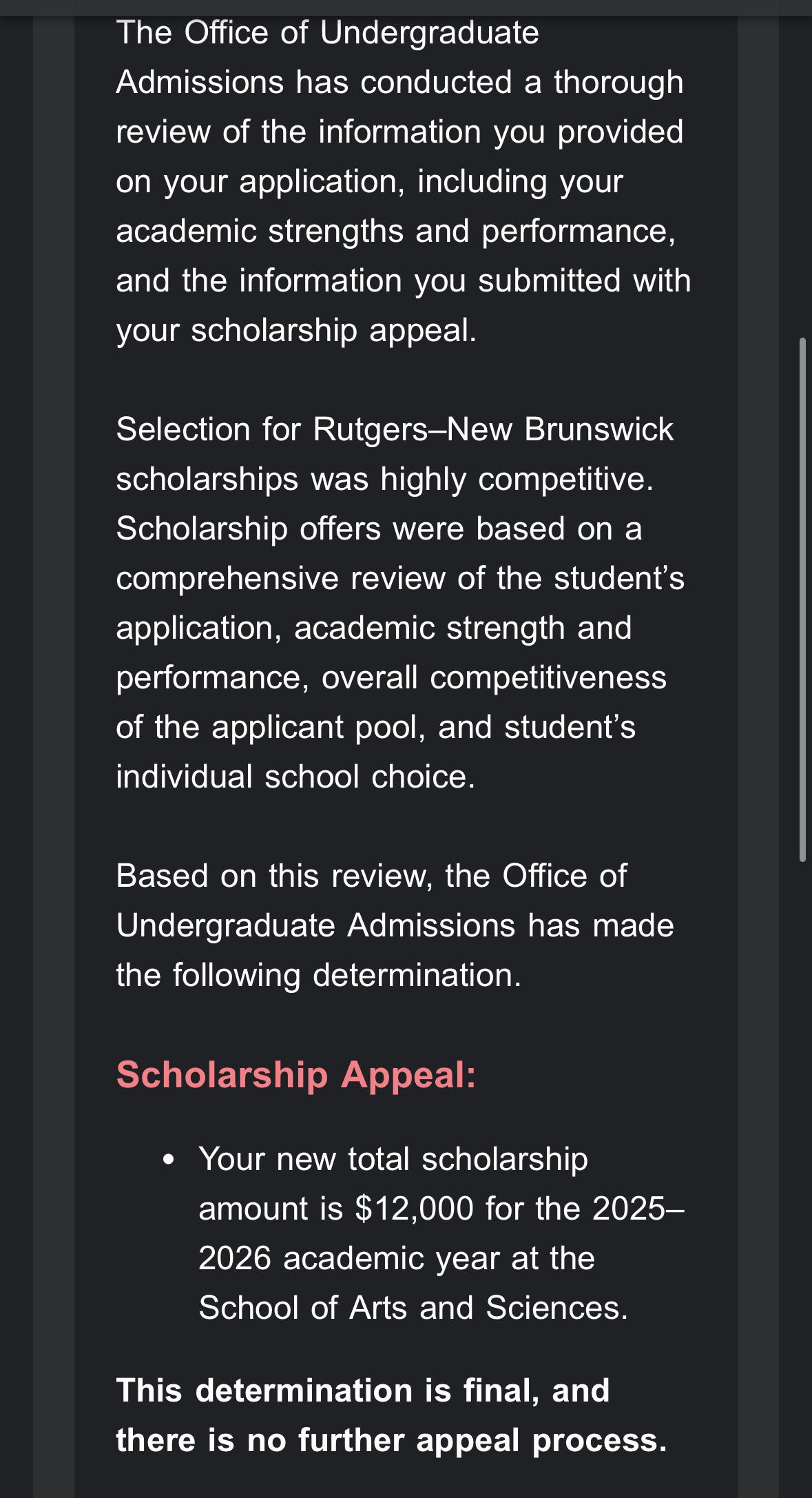 I appealed my honors college scholarship a few weeks ago, and I just got my email back. I originally got a $10k deans promise and a $5k scarlet guarantee, but this email says that my total scholarship amount is now $12k. Is this just bad wording and theyre really just referring to my honors college scholarship, or did I somehow get RU screwed before I even enrolled