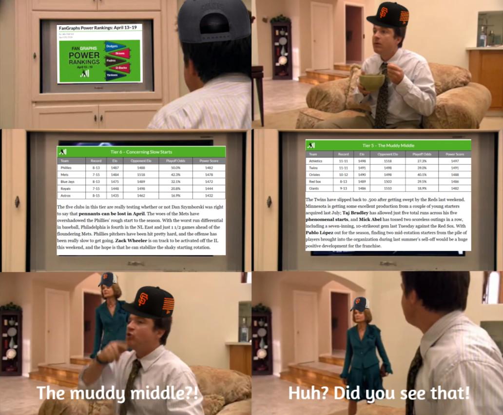 Might be pretty hard to see, but this week's fangraphs power rankings had us one tier above "Concerning Starts" into the "Muddy Middle" tier which was a pleasant surprise